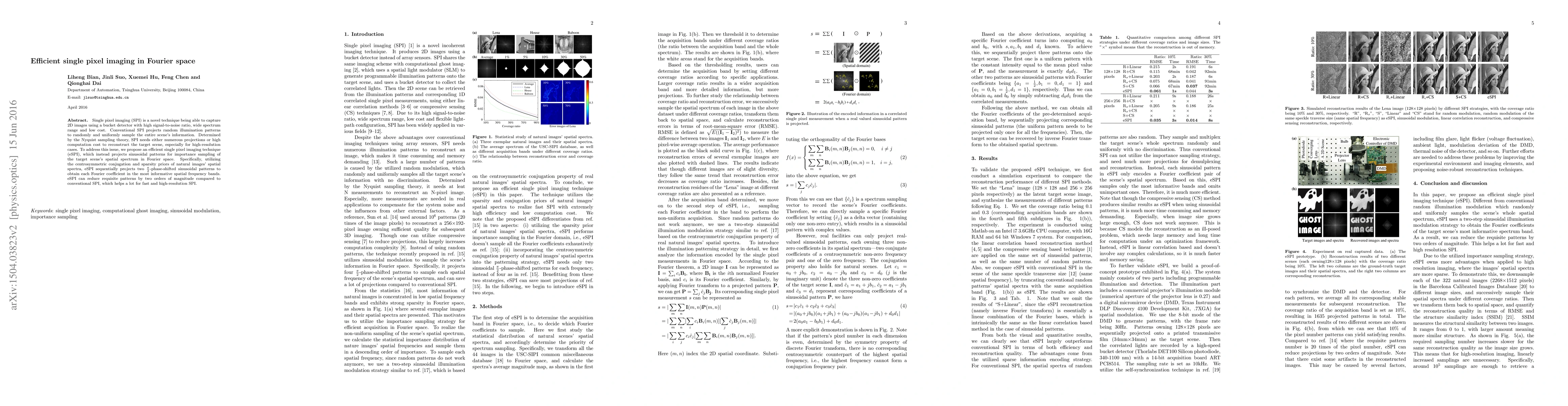 This paper proposes an efficient single pixel imaging technique (eSPI) that uses sinusoidal patterns to sample the Fourier spectrum of a scene, significantly reducing the number of required projections compared to conventional methods, thus enabling faster and higher-resolution imaging with lower computational costs.