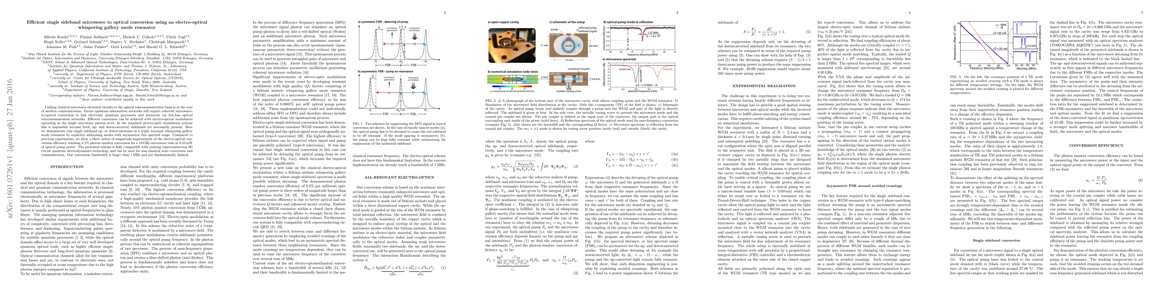 This paper demonstrates a highly efficient single sideband microwave to optical conversion using an electro-optical whispering gallery mode resonator, achieving a three orders of magnitude improvement in efficiency and compatibility with superconducting quantum technologies. The method allows for a conversion bandwidth larger than 1MHz.