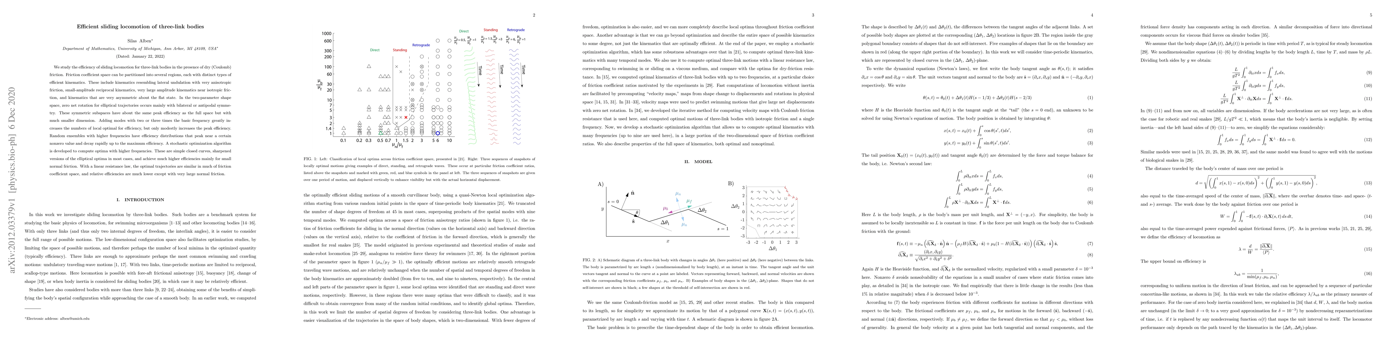We study the efficiency of sliding locomotion for three-link bodies in the presence of dry (Coulomb) friction. Friction coefficient space can be partitioned into several regions, each with distinct types of efficient kinematics. These include kinematics resembling lateral undulation with very anisotropic friction, small-amplitude reciprocal kinematics, very large amplitude kinematics near isotropic friction, and kinematics that are very asymmetric about the flat state. In the two-parameter shape space, zero net rotation for elliptical trajectories occurs mainly with bilateral or antipodal symmetry. These symmetric subspaces have about the same peak efficiency as the full space but with much smaller dimension. Adding modes with two or three times the basic frequency greatly increases the numbers of local optimal for efficiency, but only modestly increases the peak efficiency. Random ensembles with higher frequencies have efficiency distributions that peak near a certain nonzero value and decay rapidly up to the maximum efficiency. A stochastic optimization algorithm is developed to compute optima with higher frequencies. These are simple closed curves, sharpened versions of the elliptical optima in most cases, and achieve much higher efficiencies mainly for small normal friction. With a linear resistance law, the optimal trajectories are similar in much of friction coefficient space, and relative efficiencies are much lower except with very large normal friction.
