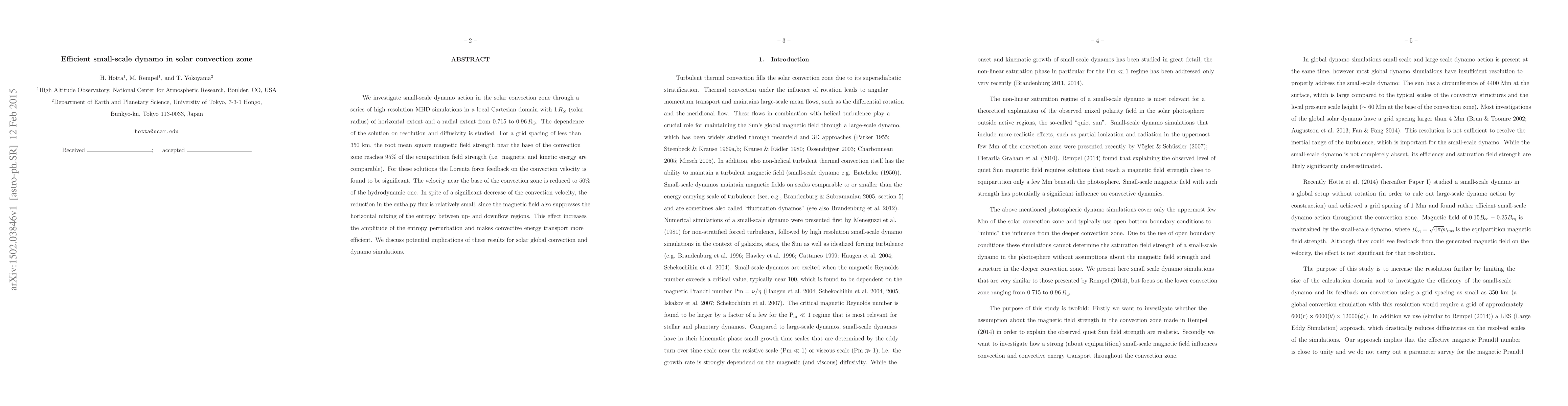 This study investigates small-scale dynamo action in the solar convection zone using high-resolution MHD simulations, revealing that magnetic fields can reach 95% of equipartition strength. The Lorentz force significantly reduces convection velocity by 50%, enhancing convective energy transport efficiency.