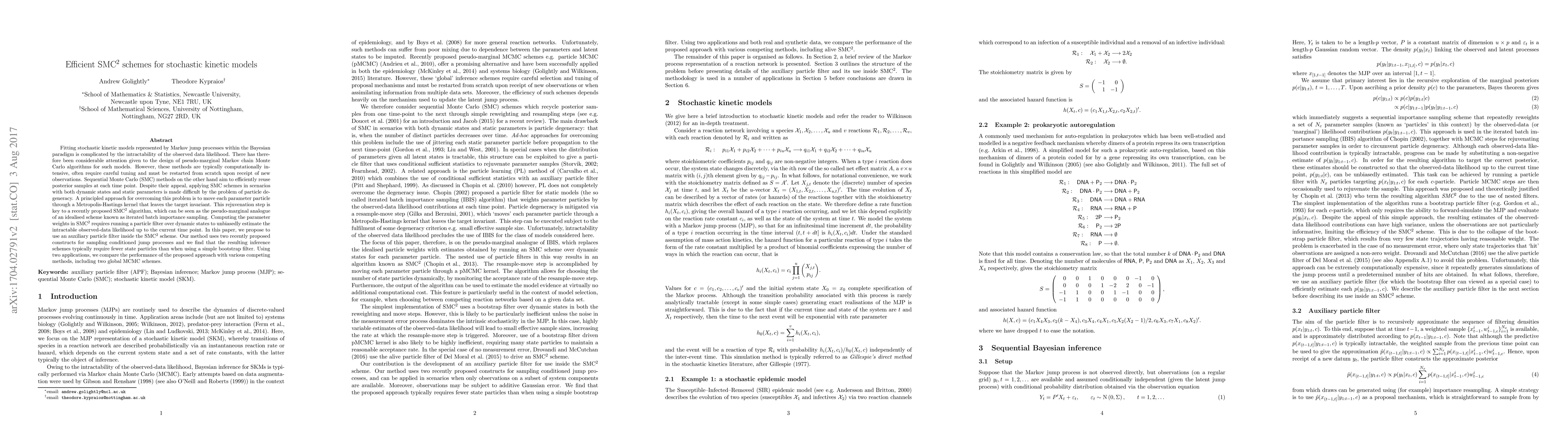 Fitting stochastic kinetic models represented by Markov jump processes within the Bayesian paradigm is complicated by the intractability of the observed data likelihood. There has therefore been considerable attention given to the design of pseudo-marginal Markov chain Monte Carlo algorithms for such models. However, these methods are typically computationally intensive, often require careful tuning and must be restarted from scratch upon receipt of new observations. Sequential Monte Carlo (SMC) methods on the other hand aim to efficiently reuse posterior samples at each time point. Despite their appeal, applying SMC schemes in scenarios with both dynamic states and static parameters is made difficult by the problem of particle degeneracy. A principled approach for overcoming this problem is to move each parameter particle through a Metropolis-Hastings kernel that leaves the target invariant. This rejuvenation step is key to a recently proposed SMC$^2$ algorithm, which can be seen as the pseudo-marginal analogue of an idealised scheme known as iterated batch importance sampling. Computing the parameter weights in SMC$^2$ requires running a particle filter over dynamic states to unbiasedly estimate the intractable observed data likelihood contributions at each time point. In this paper, we propose to use an auxiliary particle filter inside the SMC$^2$ scheme. Our method uses two recently proposed constructs for sampling conditioned jump processes and we find that the resulting inference schemes typically require fewer state particles than when using a simple bootstrap filter. Using two applications, we compare the performance of the proposed approach with various competing methods, including two global MCMC schemes.