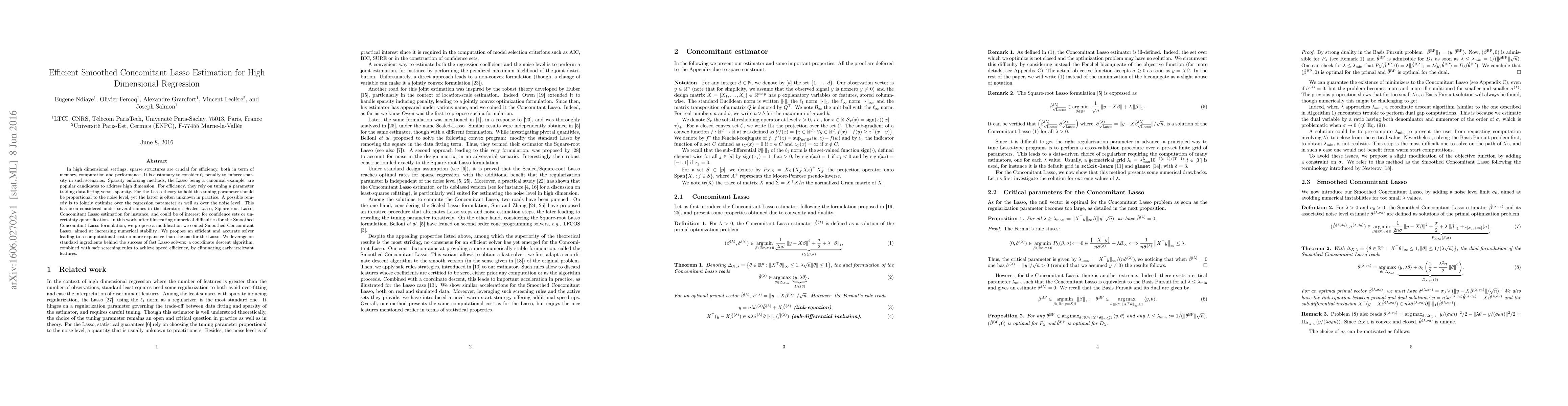 This paper proposes an efficient Smoothed Concomitant Lasso method for high-dimensional regression, addressing numerical stability issues and improving computational efficiency comparable to the Lasso. It utilizes a coordinate descent algorithm with screening rules to enhance speed.