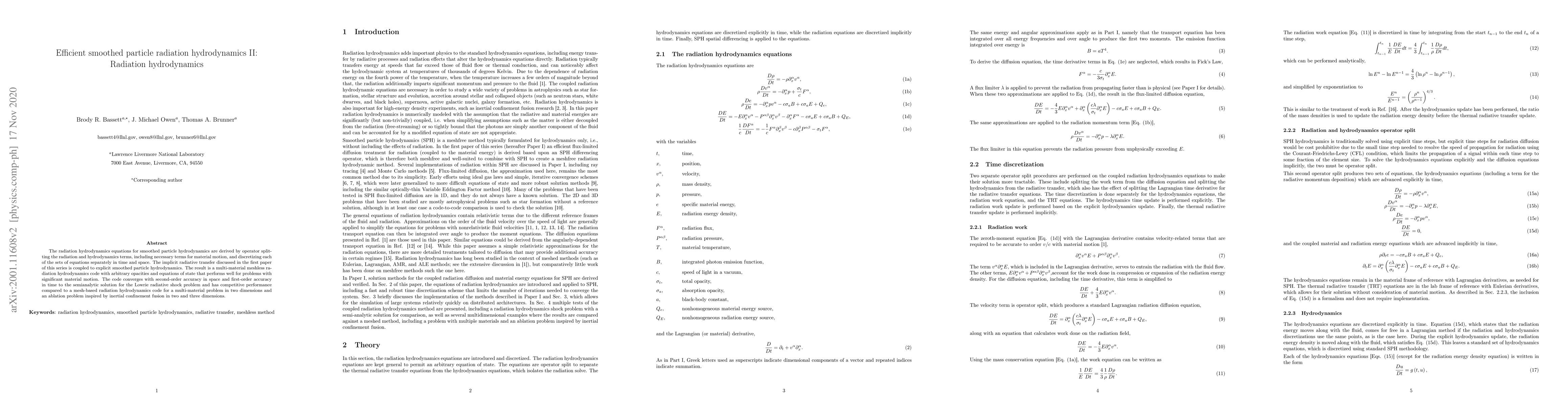 The radiation hydrodynamics equations for smoothed particle hydrodynamics are derived by operator splitting the radiation and hydrodynamics terms, including necessary terms for material motion, and discretizing each of the sets of equations separately in time and space. The implicit radiative transfer discussed in the first paper of this series is coupled to explicit smoothed particle hydrodynamics. The result is a multi-material meshless radiation hydrodynamics code with arbitrary opacities and equations of state that performs well for problems with significant material motion. The code converges with second-order accuracy in space and first-order accuracy in time to the semianalytic solution for the Lowrie radiative shock problem and has competitive performance compared to a mesh-based radiation hydrodynamics code for a multi-material problem in two dimensions and an ablation problem inspired by inertial confinement fusion in two and three dimensions.