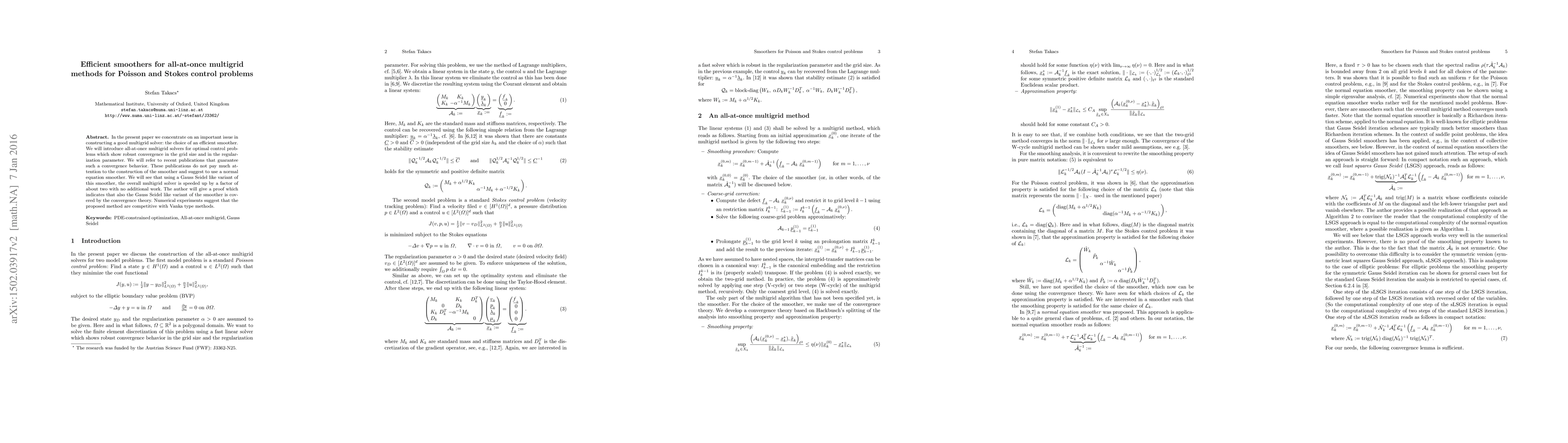 This paper introduces efficient smoothers for all-at-once multigrid methods for optimal control problems involving Poisson and Stokes equations. The proposed Gauss Seidel-like smoother variant significantly speeds up the multigrid solver by a factor of two without additional effort, maintaining robust convergence.