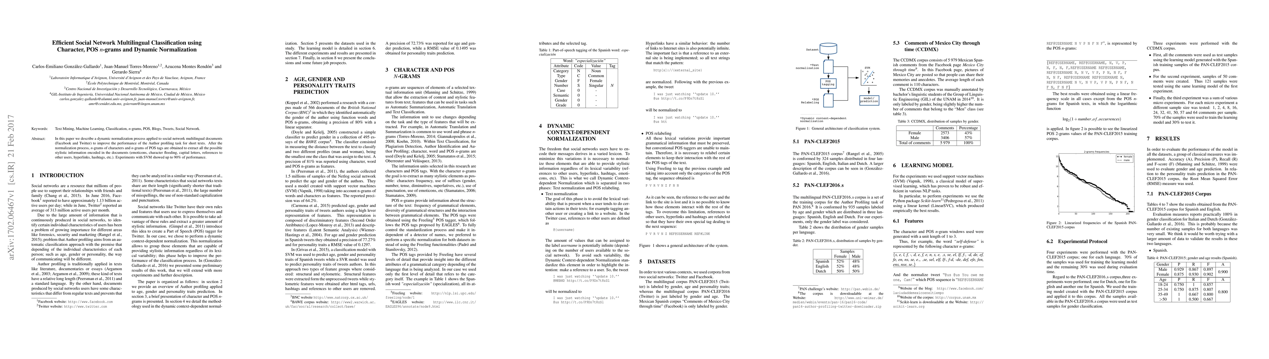 In this paper we describe a dynamic normalization process applied to social network multilingual documents (Facebook and Twitter) to improve the performance of the Author profiling task for short texts. After the normalization process, $n$-grams of characters and n-grams of POS tags are obtained to extract all the possible stylistic information encoded in the documents (emoticons, character flooding, capital letters, references to other users, hyperlinks, hashtags, etc.). Experiments with SVM showed up to 90% of performance.