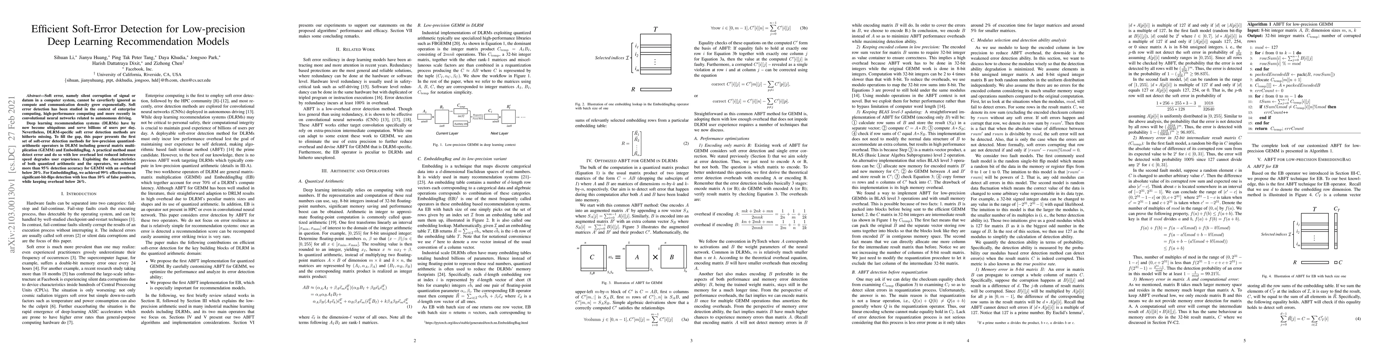 This paper introduces novel soft-error detection methods for low-precision deep learning recommendation models (DLRMs), focusing on quantized-arithmetic operators like GEMM and EmbeddingBag. The proposed methods achieve high detection accuracy with minimal overhead, ensuring efficient operation without degrading user experience.