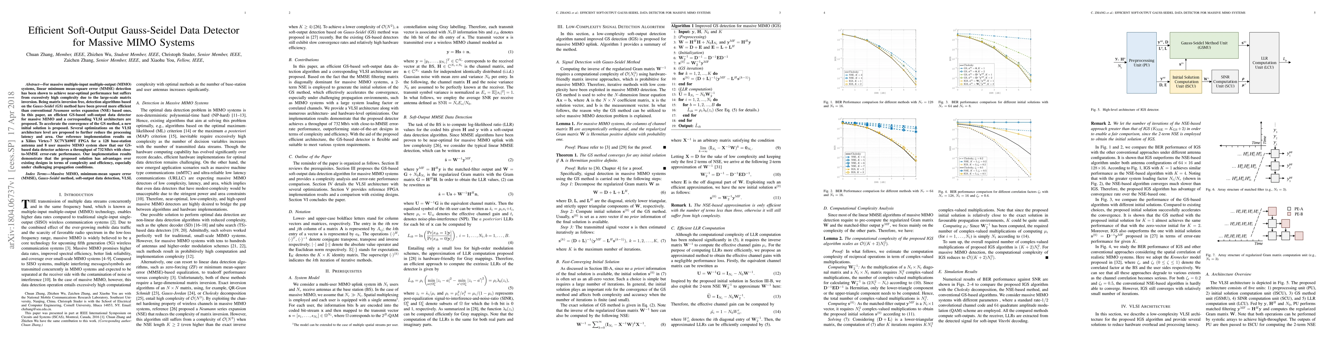 This paper presents an efficient soft-output Gauss-Seidel (GS) data detector for massive MIMO systems, achieving near-optimal performance with reduced complexity compared to conventional MMSE detection. The proposed GS-based detector, along with optimized VLSI architecture, significantly reduces processing latency and area, demonstrating a throughput of 732 Mb/s for a 128-antenna base-station system.