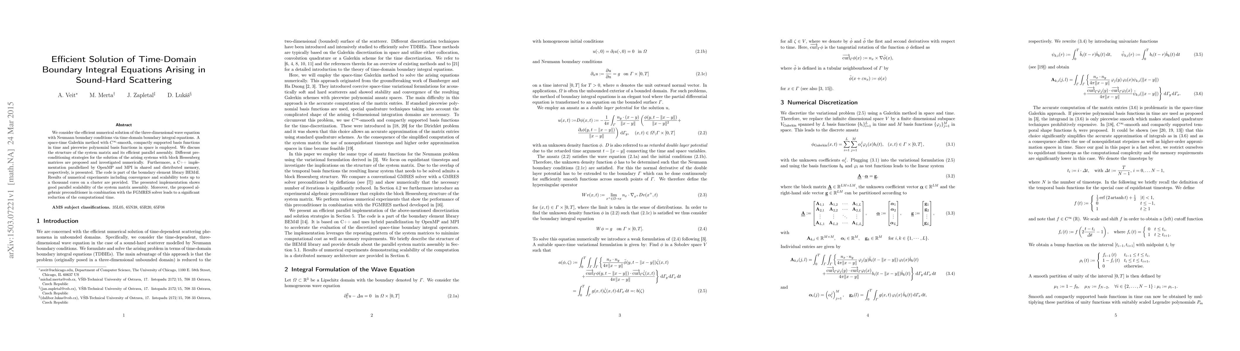 This paper presents an efficient numerical solution for the three-dimensional wave equation with Neumann boundary conditions using time-domain boundary integral equations. The method employs a space-time Galerkin approach with parallel assembly and preconditioning strategies, showing good scalability and reduced computational time in C++ implementation.