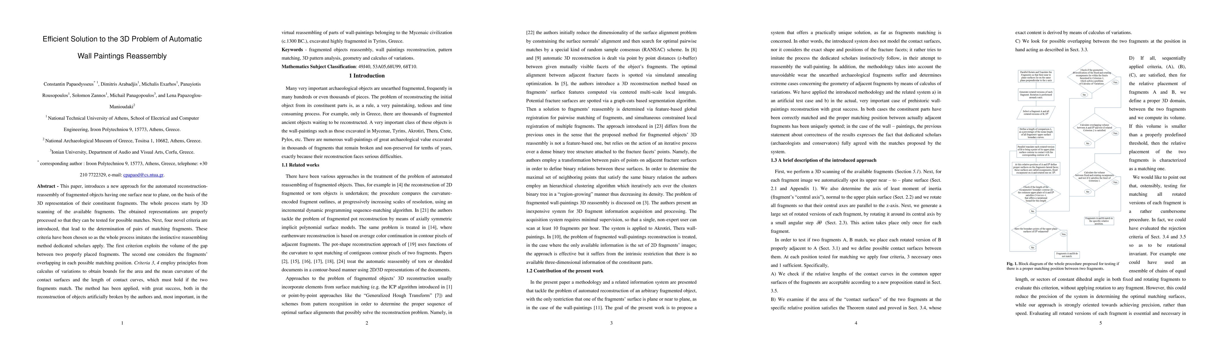 This paper introduces a new approach for the automated reconstruction - reassembly of fragmented objects having one surface near to plane, on the basis of the 3D representation of their constituent fragments. The whole process starts by 3D scanning of the available fragments. The obtained representations are properly processed so that they can be tested for possible matches. Next, four novel criteria are introduced, that lead to the determination of pairs of matching fragments. These criteria have been chosen so as the whole process imitates the instinctive reassembling method dedicated scholars apply. The first criterion exploits the volume of the gap between two properly placed fragments. The second one considers the fragments' overlapping in each possible matching position. Criteria 3,4 employ principles from calculus of variations to obtain bounds for the area and the mean curvature of the contact surfaces and the length of contact curves, which must hold if the two fragments match. The method has been applied, with great success, both in the reconstruction of objects artificially broken by the authors and, most importantly, in the virtual reassembling of parts of wall paintings belonging to the Mycenaic civilization (c. 1300 B.C.), excavated in a highly fragmented condition in Tyrins, Greece.