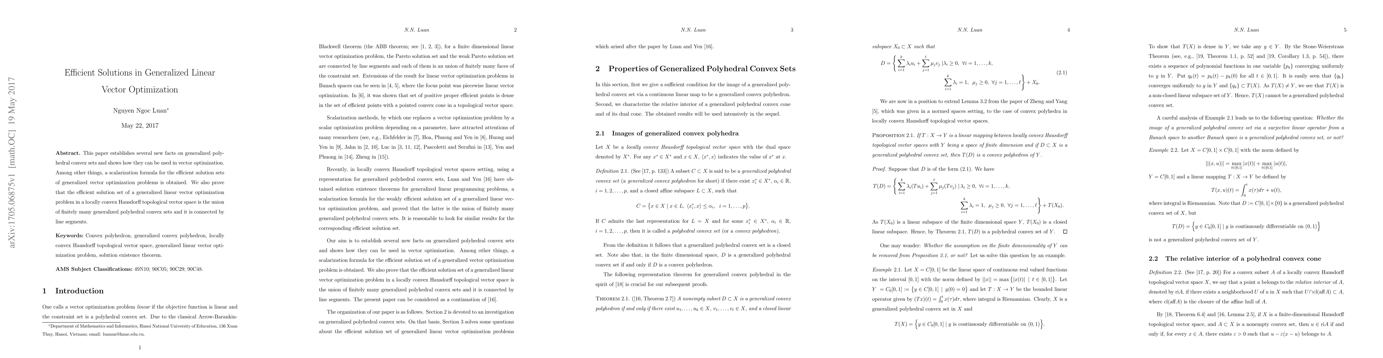 This paper establishes several new facts on generalized polyhedral convex sets and shows how they can be used in vector optimization. Among other things, a scalarization formula for the efficient solution sets of generalized vector optimization problems is obtained. We also prove that the efficient solution set of a generalized linear vector optimization problem in a locally convex Hausdorff topological vector space is the union of finitely many generalized polyhedral convex sets and it is connected by line segments.