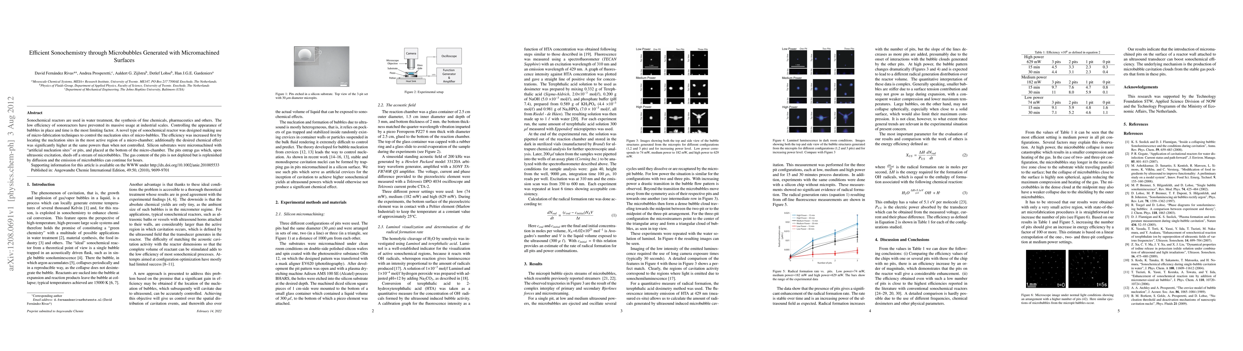 Sonochemical reactors are used in water treatment, the synthesis of fine chemicals, pharmaceutics and others. The low efficiency of sonoreactors have prevented its massive usage at industrial scales. Controlling the appearance of bubbles in place and time is the most limiting factor. A novel type of sonochemical reactor was designed making use of micro-fabrication techniques to control the nucleation sites of micro-bubbles. The efficiency was increased first by locating the nucleation sites in the most active region of a micro-chamber; additionally the desired chemical effect was significantly higher at the same powers than when not controlled. Silicon substrates were micromachined with "artificial nucleation sites" or pits, and placed at the bottom of the micro-chamber. The pits entrap gas which, upon ultrasonic excitation, sheds off a stream of microbubbles. The gas content of the pits is not depleted but is replenished by diffusion and the emission of microbubbles can continue for hours.