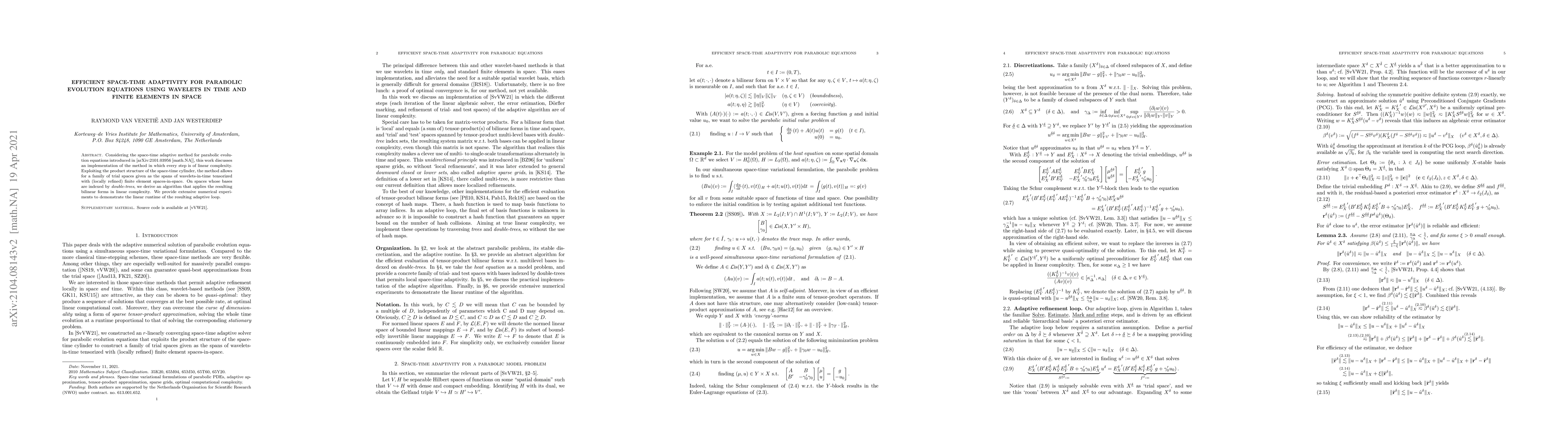 This paper presents a space-time adaptive method for solving parabolic evolution equations, utilizing wavelets in time and finite elements in space, achieving linear complexity per step. The method leverages the product structure of the space-time cylinder and employs double-tree indexed bases to achieve efficient computation.