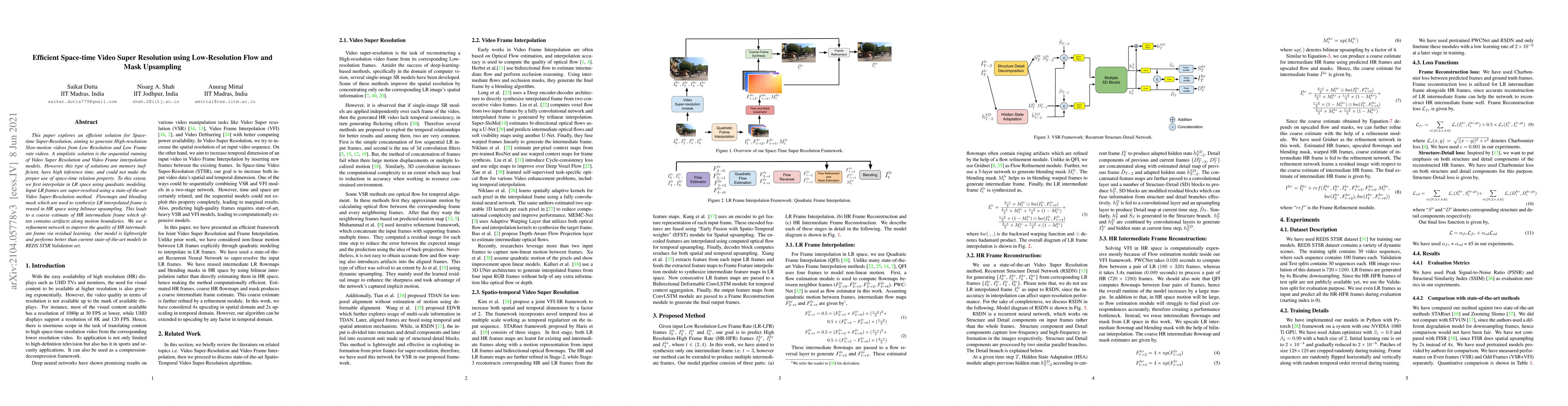 This paper proposes an efficient method for Space-time Super-Resolution to generate high-resolution slow-motion videos from low-resolution inputs, utilizing low-resolution flow and mask upsampling to improve performance and reduce computational costs. The approach leverages a refinement network to enhance the quality of super-resolved frames.