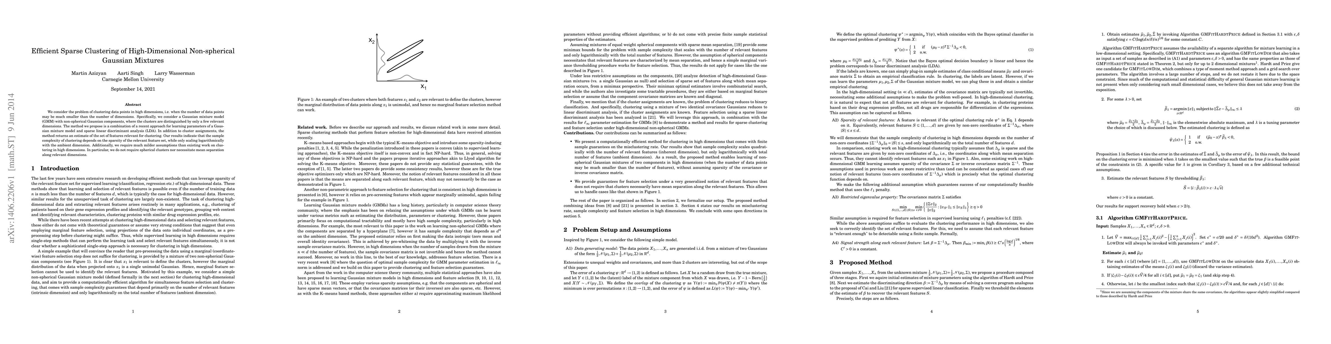 This paper proposes an efficient method for clustering high-dimensional non-spherical Gaussian mixture models by combining Gaussian mixture model learning with sparse linear discriminant analysis. The method identifies relevant features for clustering and demonstrates logarithmic scaling in sample complexity with respect to ambient dimension.