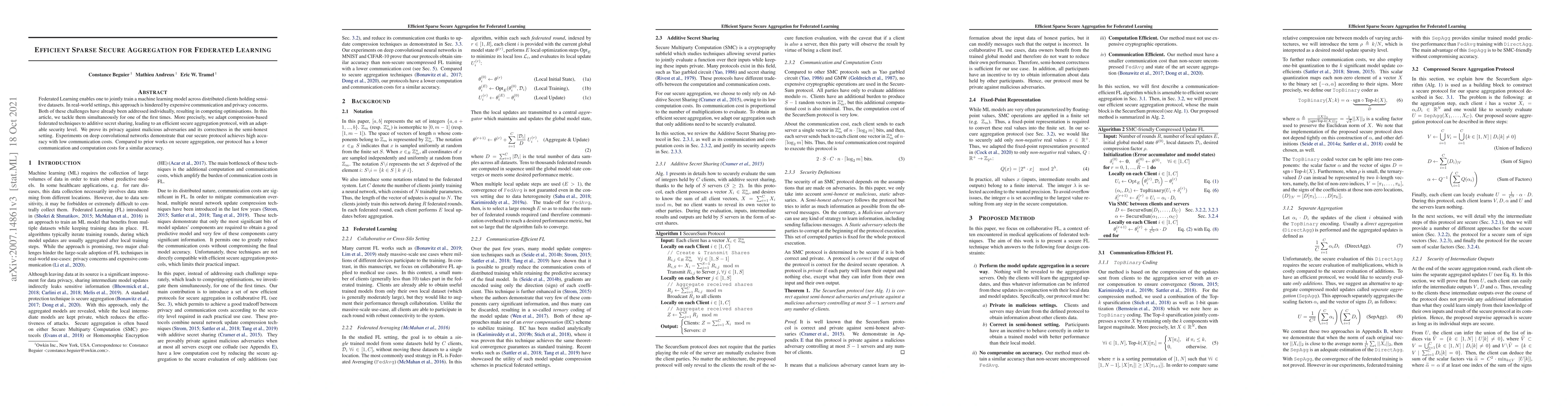This paper proposes an efficient sparse secure aggregation protocol for federated learning that addresses both communication costs and privacy concerns simultaneously. The protocol combines compression techniques with additive secret sharing, achieving high accuracy while significantly reducing communication and computation costs compared to prior methods.