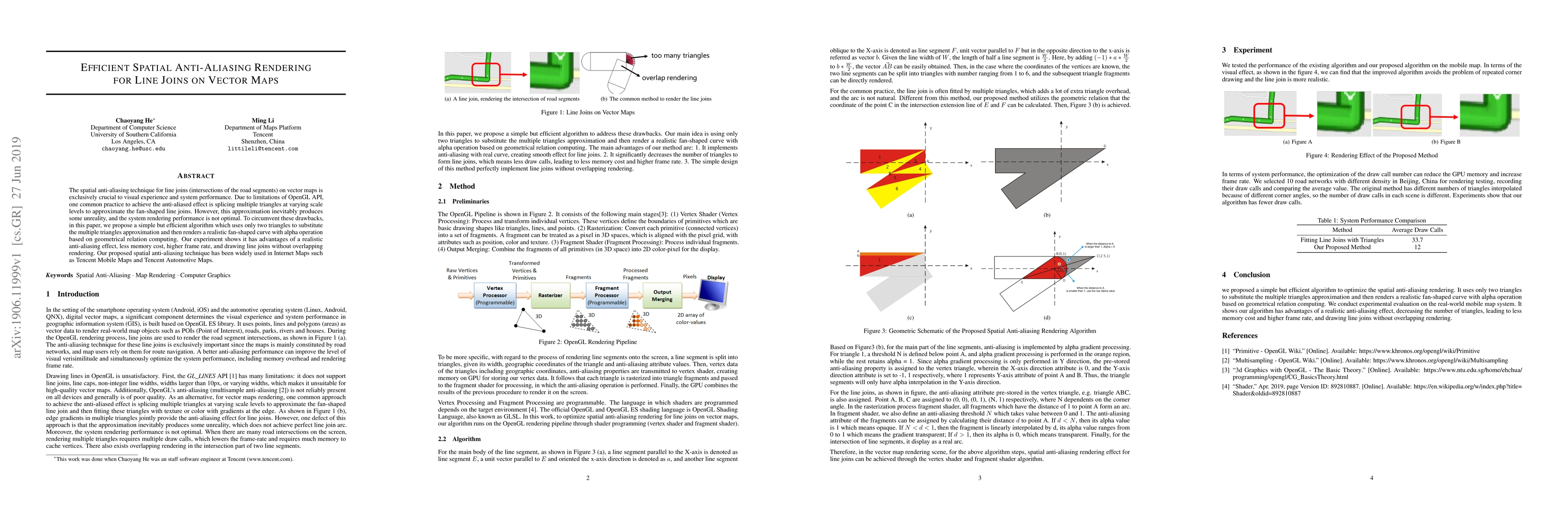 This paper proposes an efficient spatial anti-aliasing algorithm for rendering realistic line joins on vector maps using only two triangles instead of multiple triangles, achieving better visual quality, lower memory usage, and higher rendering performance. The method has been successfully implemented in Tencent Mobile Maps and Tencent Automotive Maps.