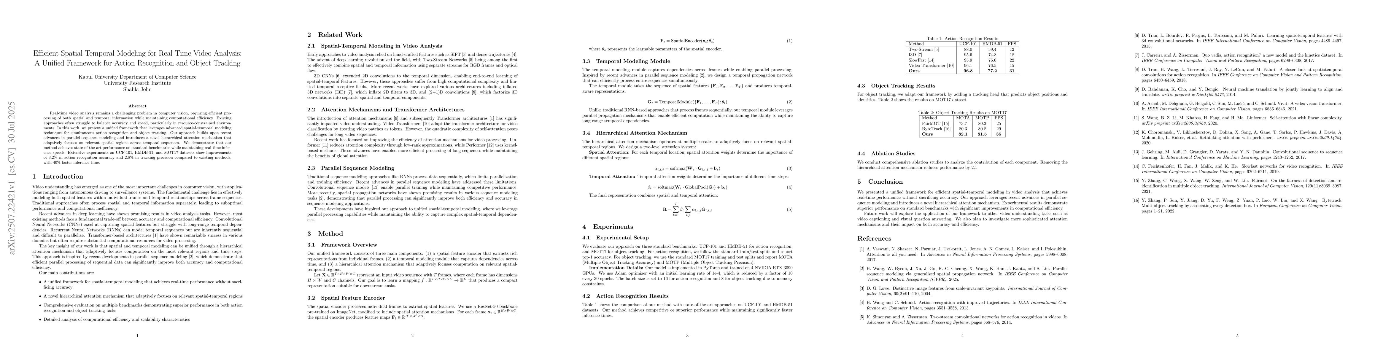 Real-time video analysis remains a challenging problem in computer vision, requiring efficient processing of both spatial and temporal information while maintaining computational efficiency. Existing approaches often struggle to balance accuracy and speed, particularly in resource-constrained environments. In this work, we present a unified framework that leverages advanced spatial-temporal modeling techniques for simultaneous action recognition and object tracking. Our approach builds upon recent advances in parallel sequence modeling and introduces a novel hierarchical attention mechanism that adaptively focuses on relevant spatial regions across temporal sequences. We demonstrate that our method achieves state-of-the-art performance on standard benchmarks while maintaining real-time inference speeds. Extensive experiments on UCF-101, HMDB-51, and MOT17 datasets show improvements of 3.2% in action recognition accuracy and 2.8% in tracking precision compared to existing methods, with 40% faster inference time.