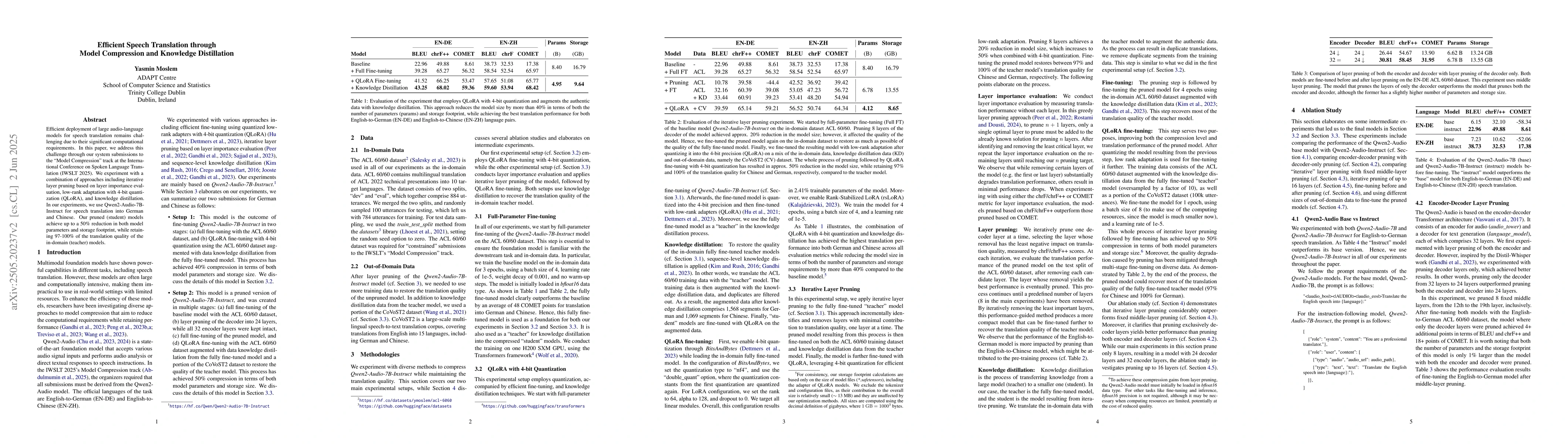 This paper presents a solution for efficiently deploying large speech translation models by reducing their size through model compression and knowledge distillation techniques. The researchers used iterative layer pruning, low-rank adaptation with 4-bit quantization (QLoRA), and knowledge distillation on Qwen2-Audio-7B-Instruct model for German and Chinese translation. They achieved up to 50% reduction in model parameters and storage footprint, while preserving 97-100% translation quality.