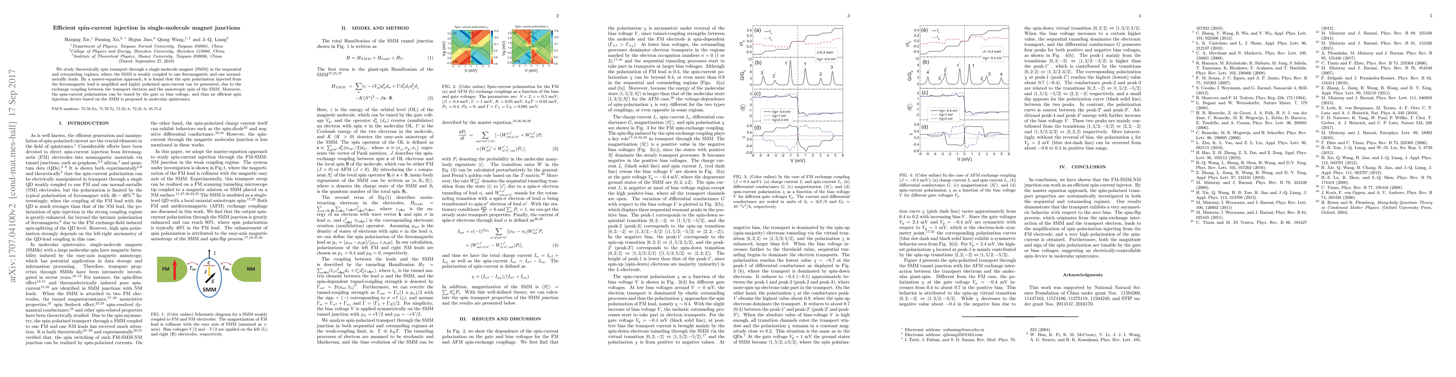 This paper theoretically investigates spin transport in single-molecule magnet junctions, revealing amplified and highly polarized spin-current injection due to exchange coupling. The spin-current polarization can be tuned via gate or bias voltage, proposing a potential efficient spin injection device for molecular spintronics.