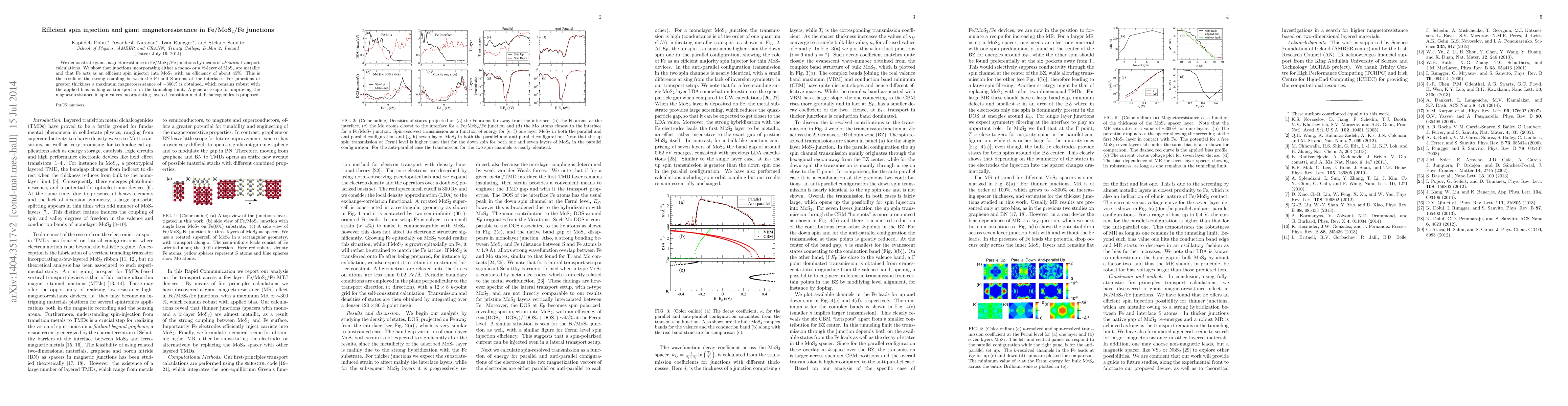 This paper demonstrates giant magnetoresistance in Fe/MoS$_2$/Fe junctions using \textit{ab-initio} transport calculations, showing that Fe efficiently injects spin into MoS$_2$ with 45% efficiency due to strong Fe-S coupling. The study finds a maximum magnetoresistance of about 300% in thicker junctions, which remains stable under bias when transport is tunneling-limited.