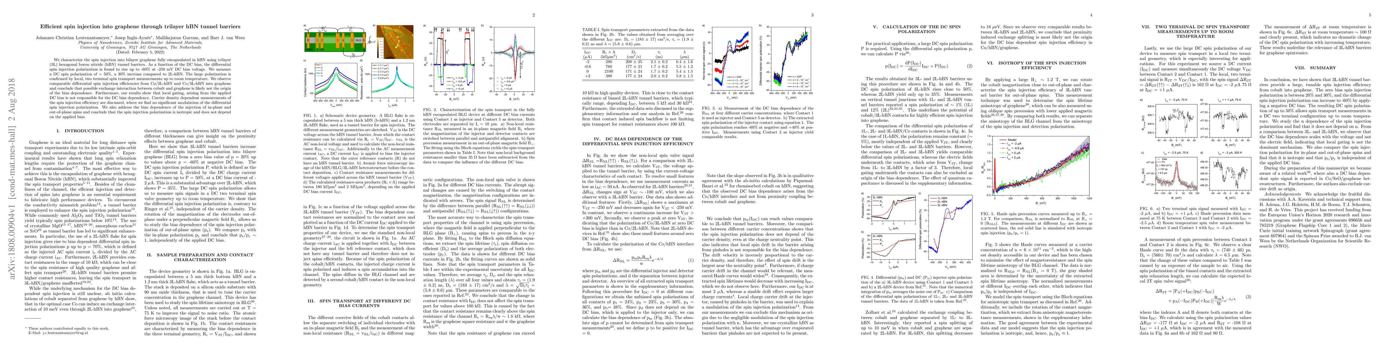 This study investigates spin injection efficiency into bilayer graphene encapsulated in hBN, finding a significant increase to 60% at -250 mV bias using trilayer hBN barriers. The results suggest an isotropic spin polarization and rule out exchange interaction or local gating as the cause of bias dependence.