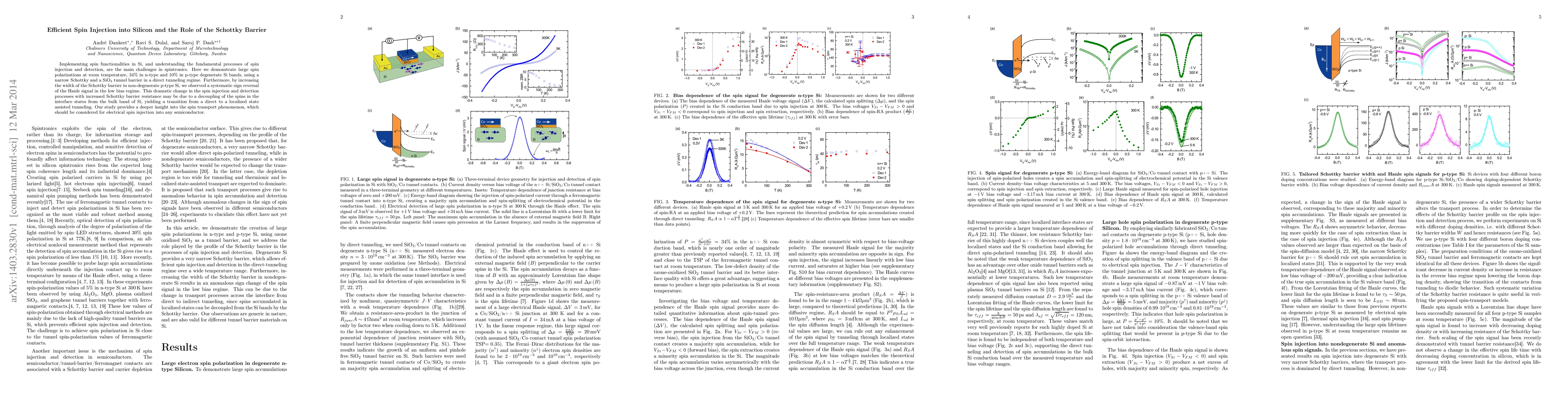The paper demonstrates high spin polarization in silicon using Schottky and SiO2 tunnel barriers, achieving 34% in n-type and 10% in p-type Si. It also reveals a sign reversal in Hanle signal with increased Schottky barrier width, suggesting a transition from direct to localized state-assisted tunneling, offering insights into spin transport mechanisms.