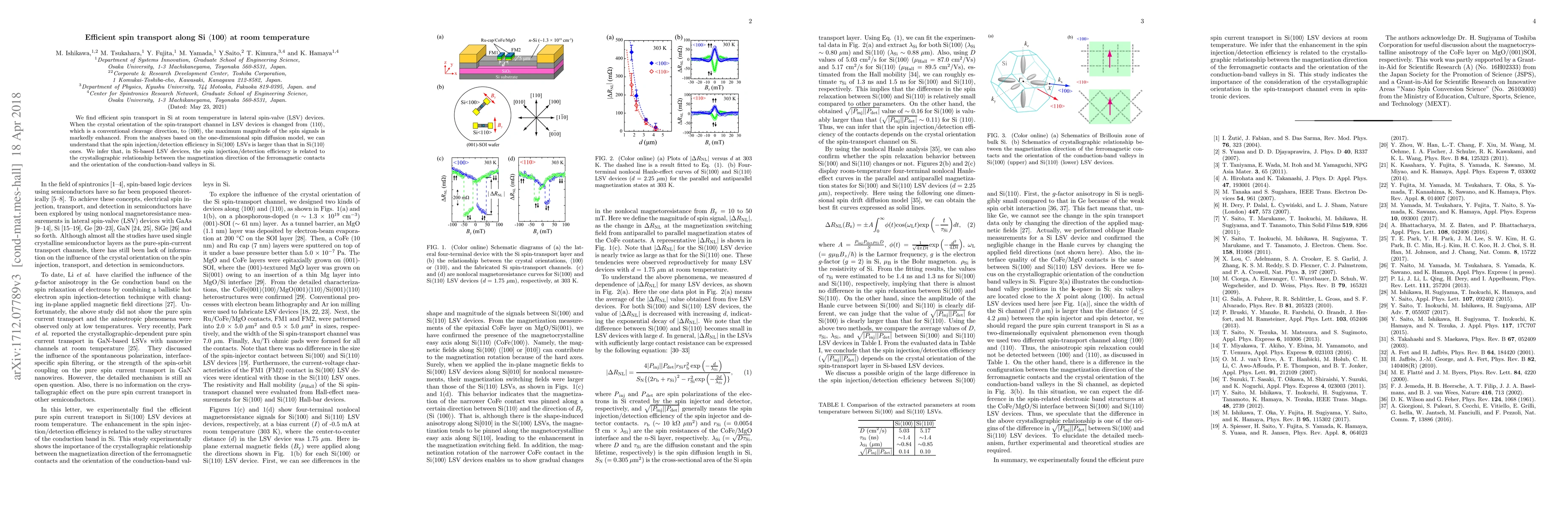 We find efficient spin transport in Si at room temperature in lateral spin valves (LSVs). When the crystal orientation of the spin-transport channel in LSVs is changed from $\langle$110$\rangle$, which is a conventional cleavage direction, to $\langle$100$\rangle$, the maximum magnitude of the spin signals is markedly enhanced. From the analyses based on the one-dimensional spin diffusion model, we can understand that the spin injection/detection efficiency in Si$\langle$100$\rangle$ LSVs is larger than that in Si$\langle$110$\rangle$ ones. We infer that, in Si-based LSVs, the spin detection efficiency of the pure spin current is related to the crystallographic orientation of the valley structures of the conduction band in Si.