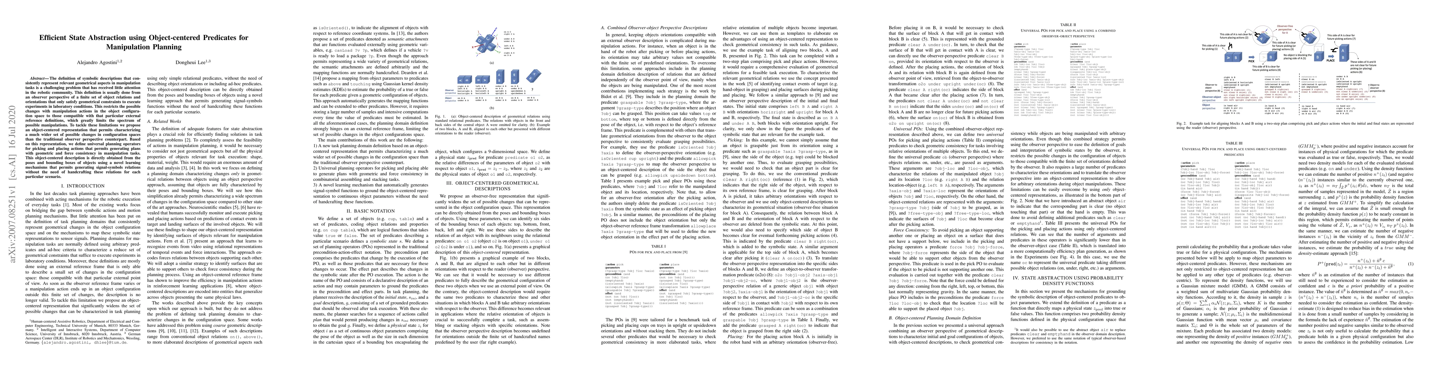 This paper proposes an object-centered predicate abstraction for manipulation planning that characterizes a broader range of possible object configurations, enabling more versatile planning operators for picking and placing tasks. The method learns signal-symbol relations from object poses and bounding boxes, eliminating the need for hand-crafted representations.