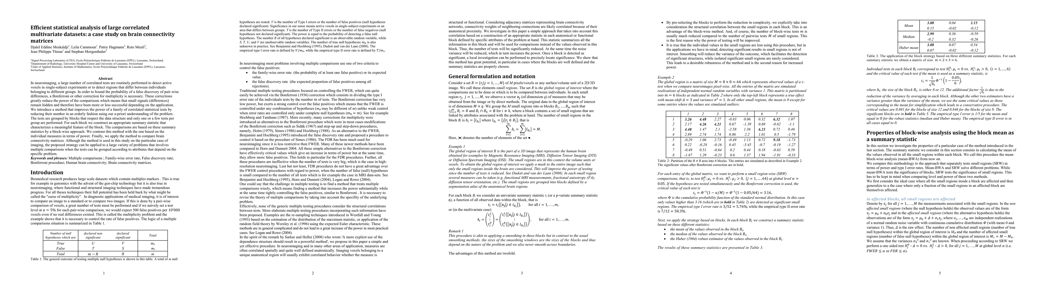 This paper introduces a novel method to enhance the power of statistical tests in large correlated multivariate datasets, specifically applied to brain connectivity matrices in neuroimaging. The proposed block-wise approach reduces the number of tests by grouping them and using summary statistics, thereby improving detection of small signals while maintaining control over the family-wise error rate.