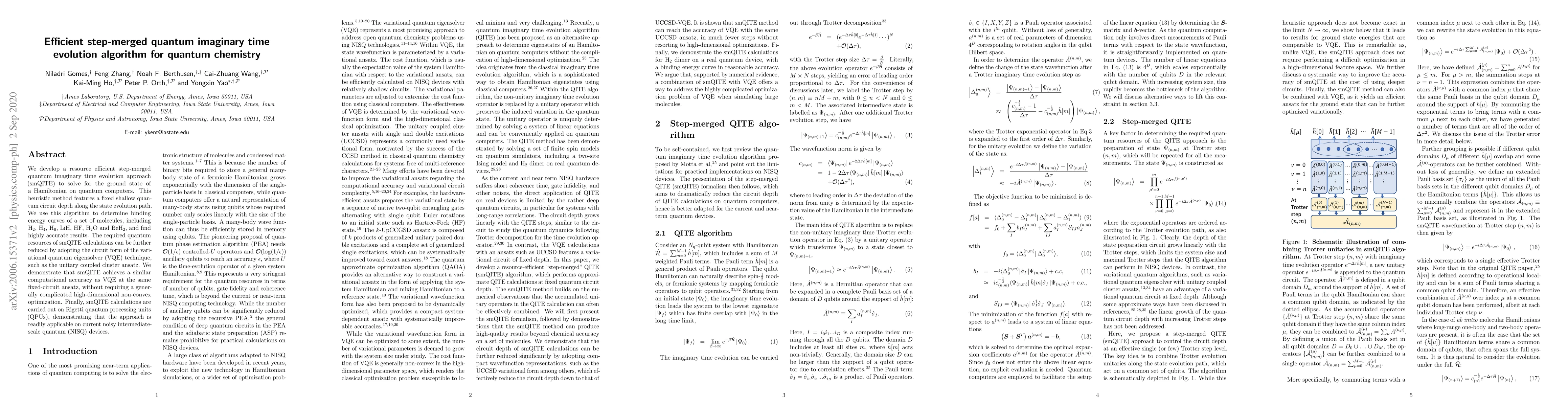 This paper introduces a step-merged quantum imaginary time evolution (smQITE) algorithm for efficiently determining ground state energies in quantum chemistry, achieving high accuracy with a fixed shallow quantum circuit depth. The method is demonstrated on various molecules and shown to be resource-efficient, comparable to VQE without complex optimization, and tested on current quantum processors.
