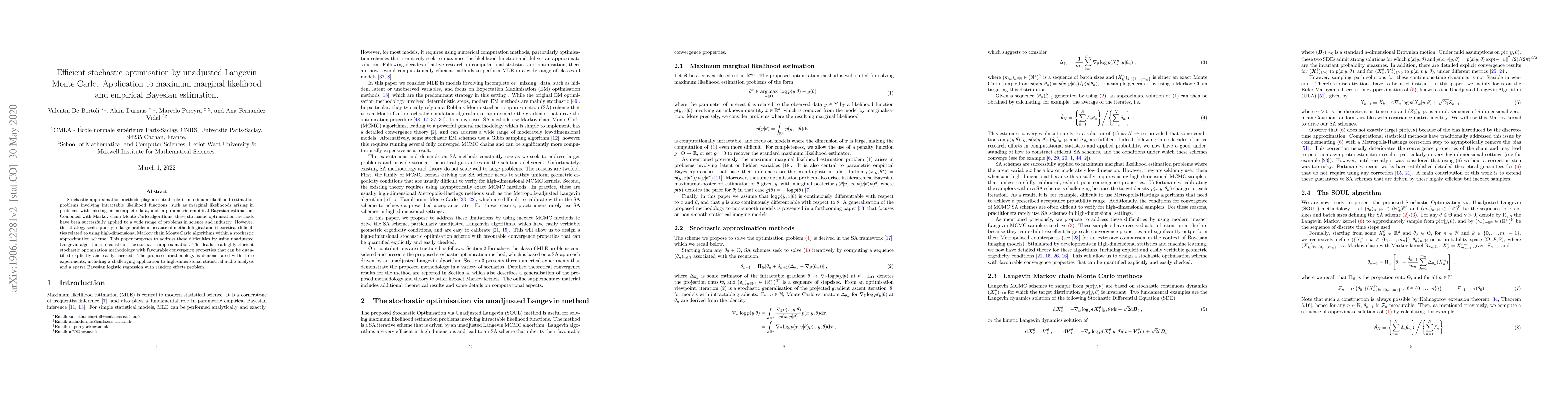 This paper proposes unadjusted Langevin algorithms for efficient stochastic optimisation, addressing the scalability issues of high-dimensional Markov chain Monte Carlo methods in stochastic approximation. The methodology is demonstrated through experiments in maximum marginal likelihood and empirical Bayesian estimation, including high-dimensional statistical audio analysis.