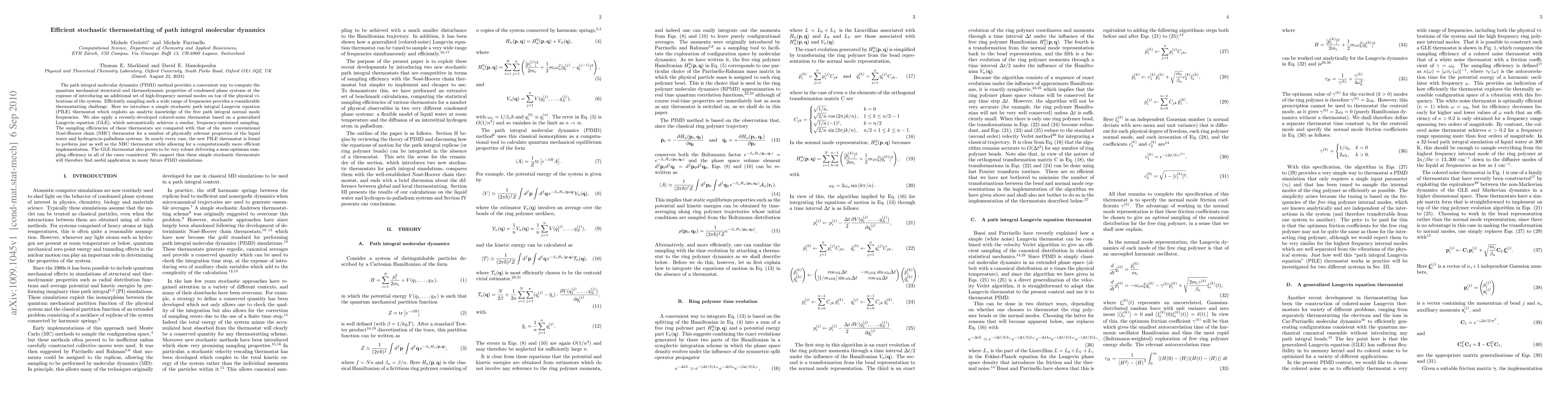 This paper introduces efficient stochastic thermostats for path integral molecular dynamics (PIMD) simulations, comparing their performance against the conventional Nosé-Hoover chain thermostat. The proposed stochastic path integral Langevin equation (PILE) and generalized Langevin equation (GLE) thermostats achieve near-optimal sampling efficiency, offering better computational efficiency and robustness for systems like liquid water and hydrogen-in-palladium.