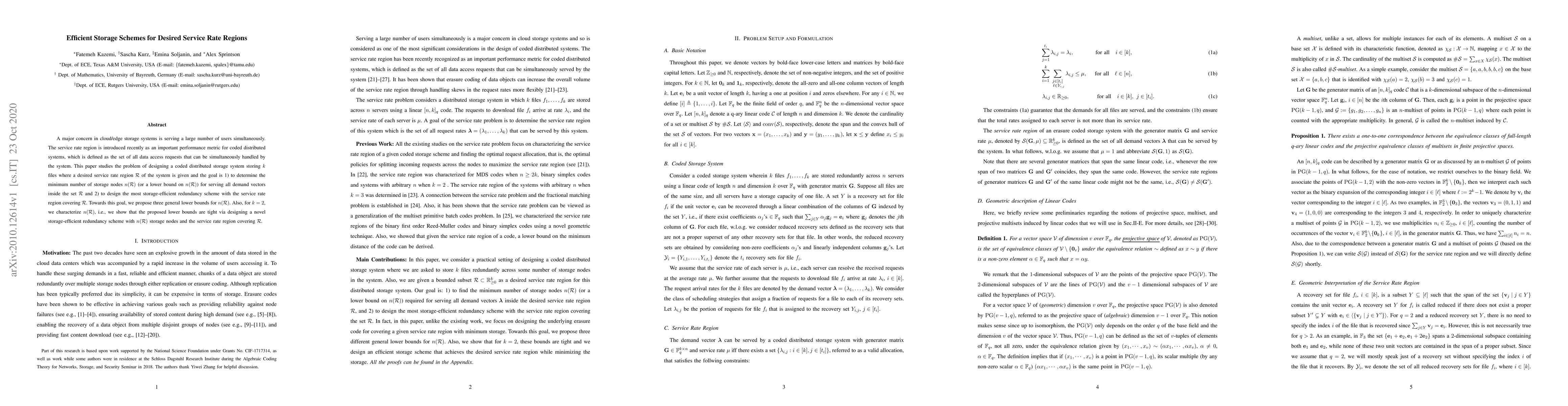 This paper investigates efficient storage schemes for coded distributed systems to serve a large number of users with a defined service rate region. It proposes lower bounds for the minimum number of storage nodes required and designs a storage-efficient redundancy scheme for k=2 files, demonstrating the tightness of the proposed bounds.