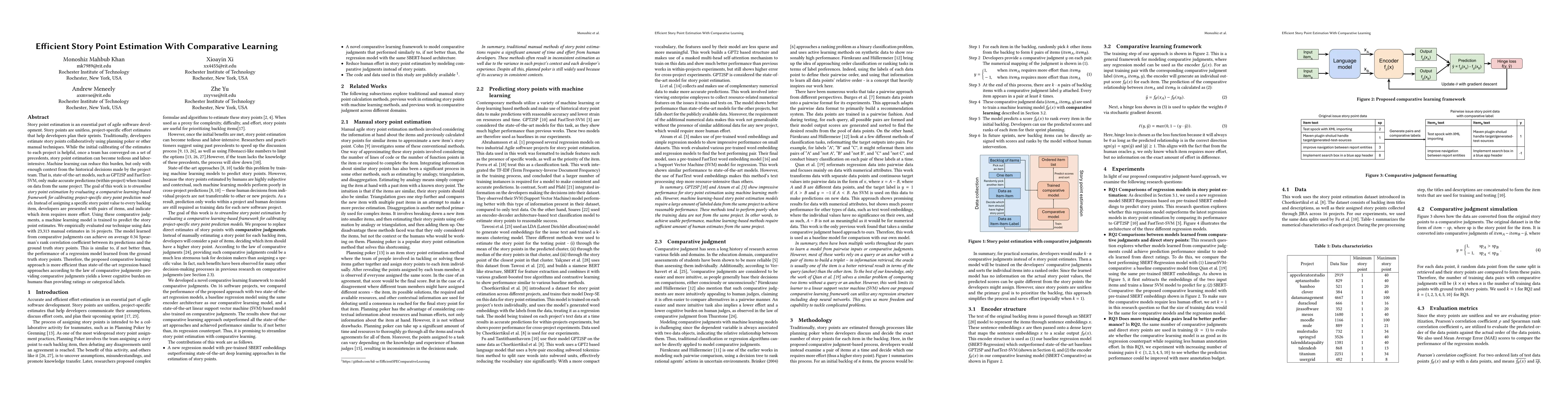 Story point estimation is an essential part of agile software development. Story points are unitless, project-specific effort estimates that help developers plan their sprints. Traditionally, developers estimate story points collaboratively using planning poker or other manual techniques. While the initial calibrating of the estimates to each project is helpful, once a team has converged on a set of precedents, story point estimation can become tedious and labor-intensive. Machine learning can reduce this burden, but only with enough context from the historical decisions made by the project team. That is, state-of-the-art models, such as GPT2SP and FastText-SVM, only make accurate predictions (within-project) when trained on data from the same project. The goal of this work is to streamline story point estimation by evaluating a comparative learning-based framework for calibrating project-specific story point prediction models. Instead of assigning a specific story point value to every backlog item, developers are presented with pairs of items, and indicate which item requires more effort. Using these comparative judgments, a machine learning model is trained to predict the story point estimates. We empirically evaluated our technique using data with 23,313 manual estimates in 16 projects. The model learned from comparative judgments can achieve on average 0.34 Spearman's rank correlation coefficient between its predictions and the ground truth story points. This is similar to, if not better than, the performance of a regression model learned from the ground truth story points. Therefore, the proposed comparative learning approach is more efficient than state-of-the-art regression-based approaches according to the law of comparative judgments - providing comparative judgments yields a lower cognitive burden on humans than providing ratings or categorical labels.