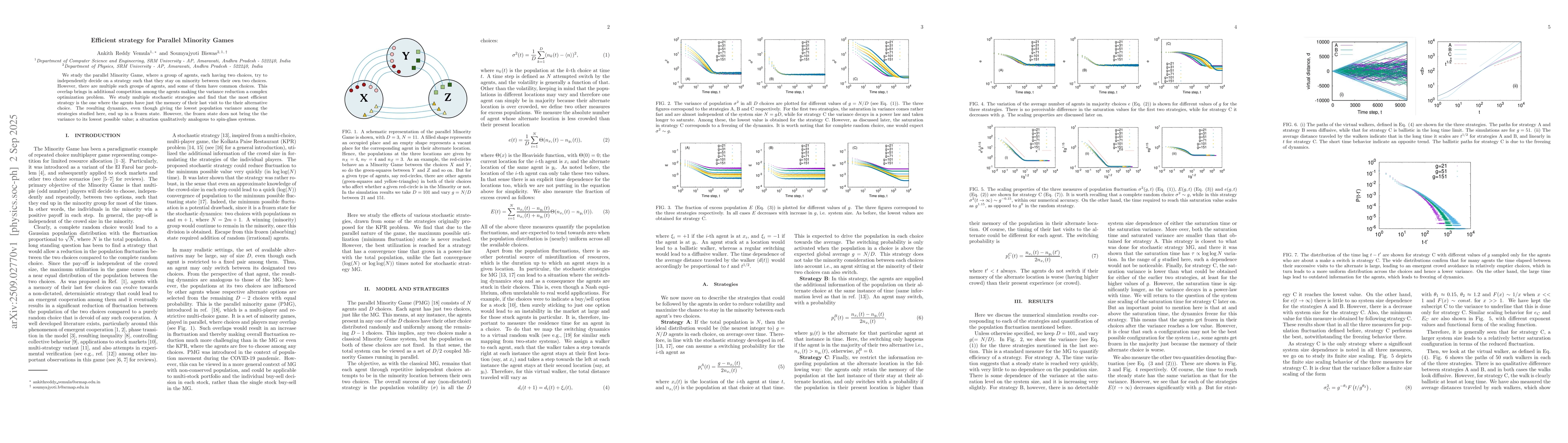 We study the parallel Minority Game, where a group of agents, each having two choices, try to independently decide on a strategy such that they stay on minority between their own two choices. However, there are multiple such groups of agents, and some of them have common choices. This overlap brings in additional competition among the agents making the variance reduction a complex optimization problem. We study multiple stochastic strategies and find that the most efficient strategy is the one where the agents have just the memory of their last visit to the their alternative choice. The resulting dynamics, even though giving the lowest population variance among the strategies studied here, end up in a frozen state. However, the frozen state does not bring the the variance to its lowest possible value; a situation qualitatively analogous to spin-glass systems.