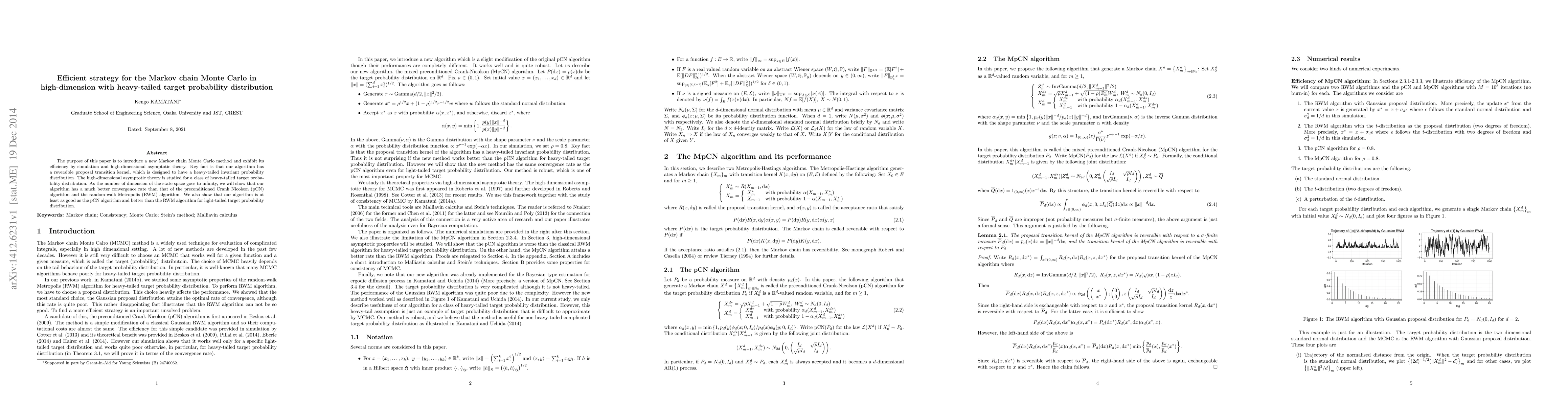 The purpose of this paper is to introduce a new Markov chain Monte Carlo method and exhibit its efficiency by simulation and high-dimensional asymptotic theory. Key fact is that our algorithm has a reversible proposal transition kernel, which is designed to have a heavy-tailed invariant probability distribution. The high-dimensional asymptotic theory is studied for a class of heavy-tailed target probability distribution. As the number of dimension of the state space goes to infinity, we will show that our algorithm has a much better convergence rate than that of the preconditioned Crank Nicolson (pCN) algorithm and the random-walk Metropolis (RWM) algorithm. We also show that our algorithm is at least as good as the pCN algorithm and better than the RWM algorithm for light-tailed target probability distribution.
