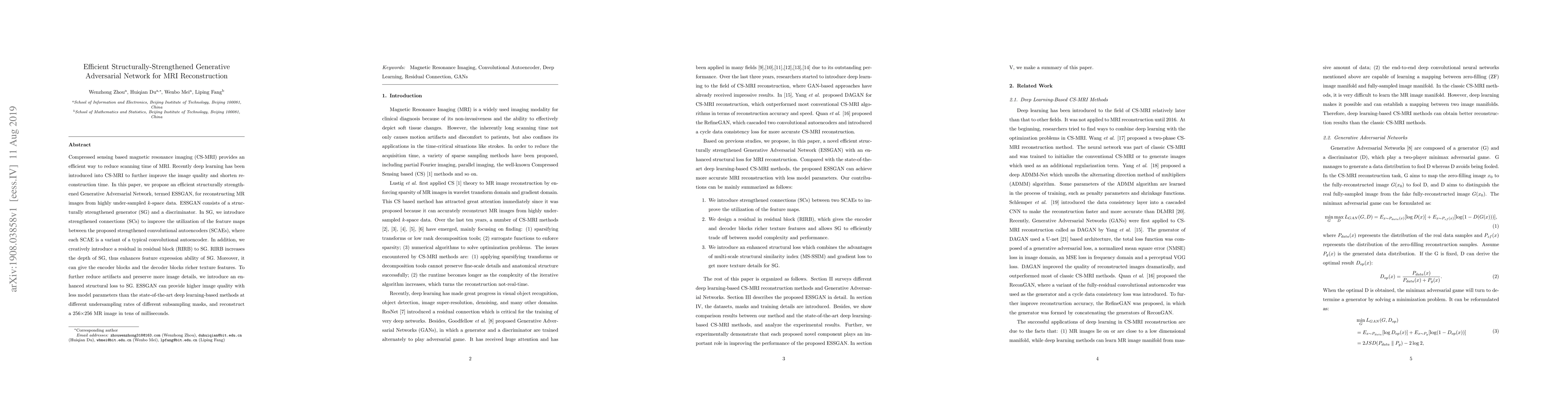 This paper proposes an Efficient Structurally-Strengthened Generative Adversarial Network (ESSGAN) for MRI reconstruction from under-sampled k-space data, featuring strengthened connections and a residual in residual block to enhance feature expression and reduce artifacts, achieving higher image quality with fewer parameters.