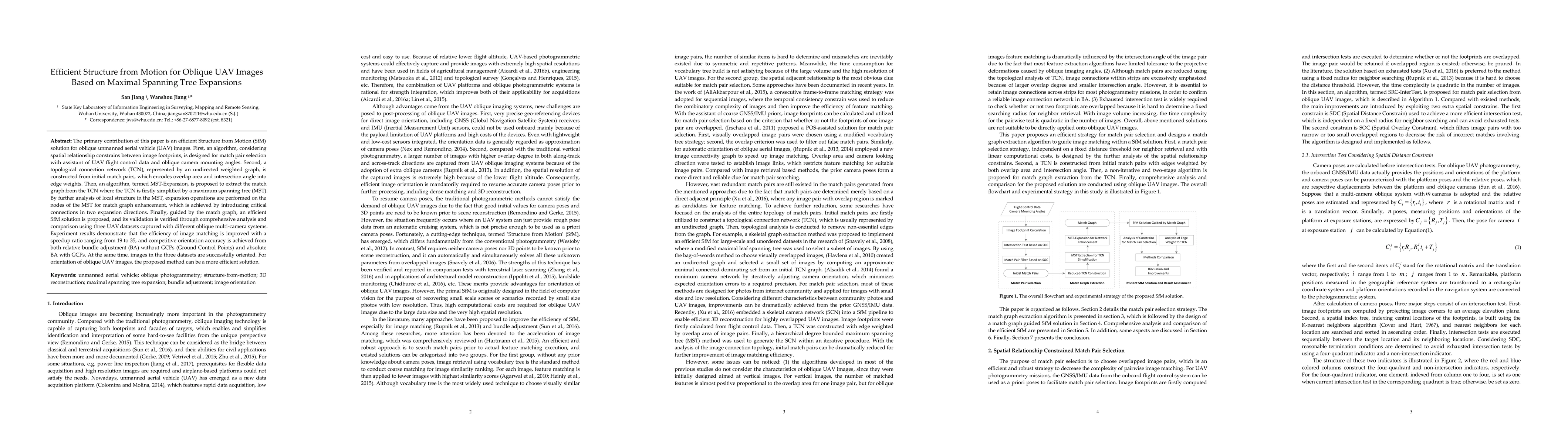 This research paper proposes an efficient Structure from Motion solution for oblique UAV images using a Maximal Spanning Tree expansion algorithm, improving image matching speed by 19-35 times while maintaining competitive accuracy.