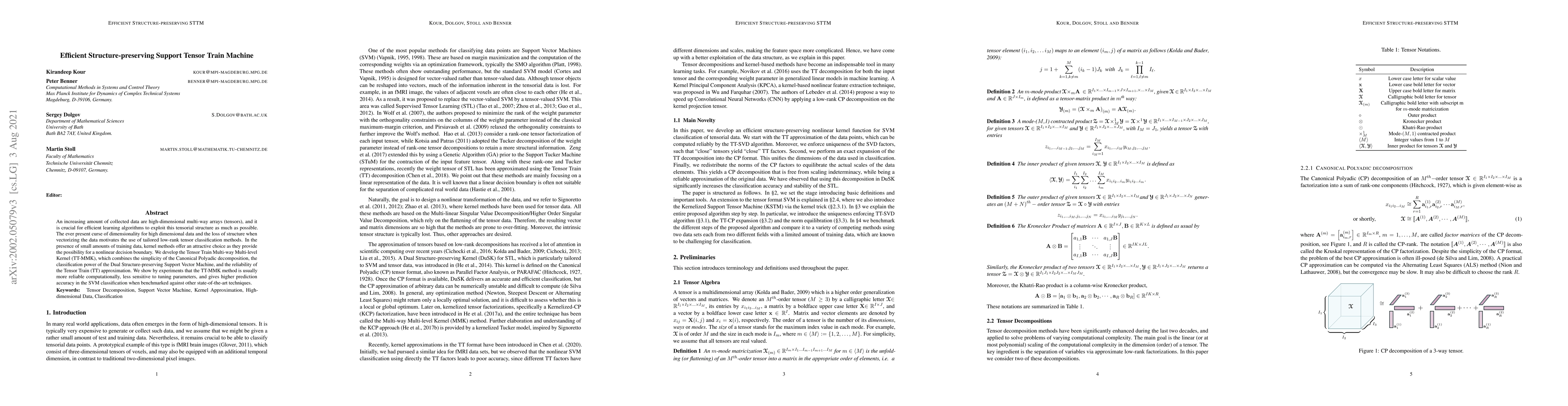 This paper proposes the Tensor Train Multi-way Multi-level Kernel (TT-MMK) method to efficiently handle high-dimensional tensor data for classification, combining low-rank tensor approximation, structure-preserving support vector machines, and kernel methods. Experiments demonstrate that TT-MMK is computationally efficient, less sensitive to parameter tuning, and provides superior classification accuracy compared to other techniques.