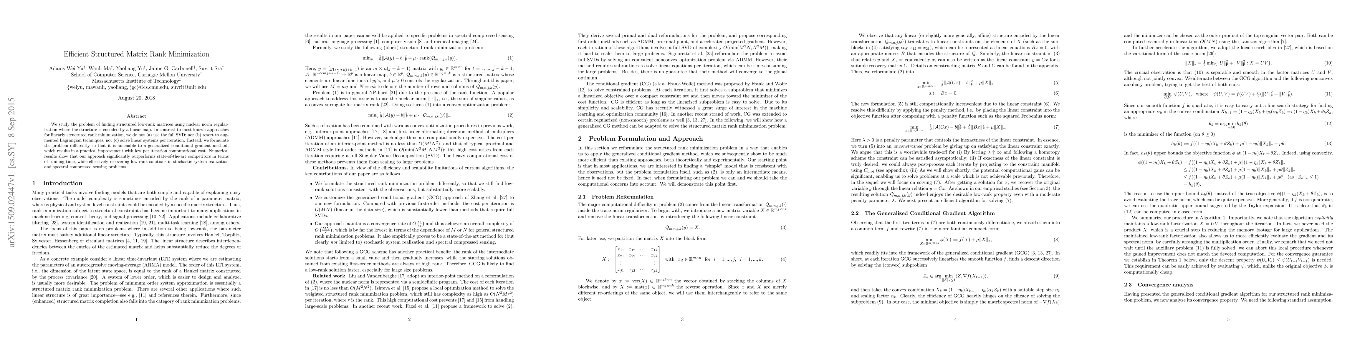 This paper presents an efficient method for structured low-rank matrix rank minimization using nuclear norm regularization without full SVD, augmented Lagrangian techniques, or iterative linear systems. It employs a generalized conditional gradient method, achieving faster runtimes and better solution recovery compared to existing methods.