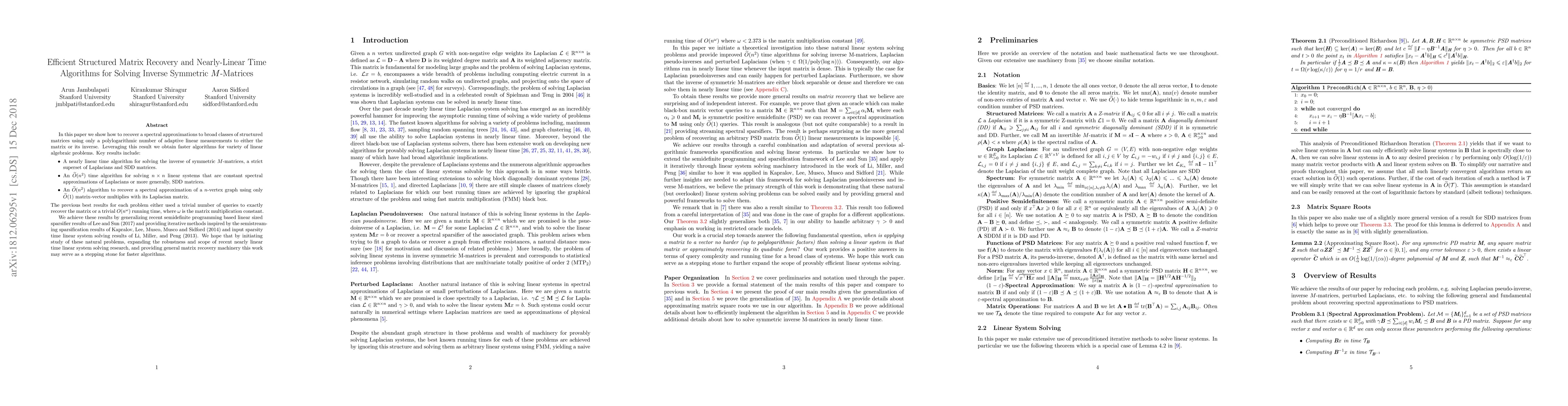 This paper presents efficient algorithms for recovering structured matrices and solving inverse symmetric $M$-matrices using a polylogarithmic number of adaptive linear measurements. Key contributions include nearly-linear time algorithms for solving inverses of symmetric $M$-matrices and solving linear systems that approximate Laplacians or SDD matrices, achieving significant improvements over previous methods.