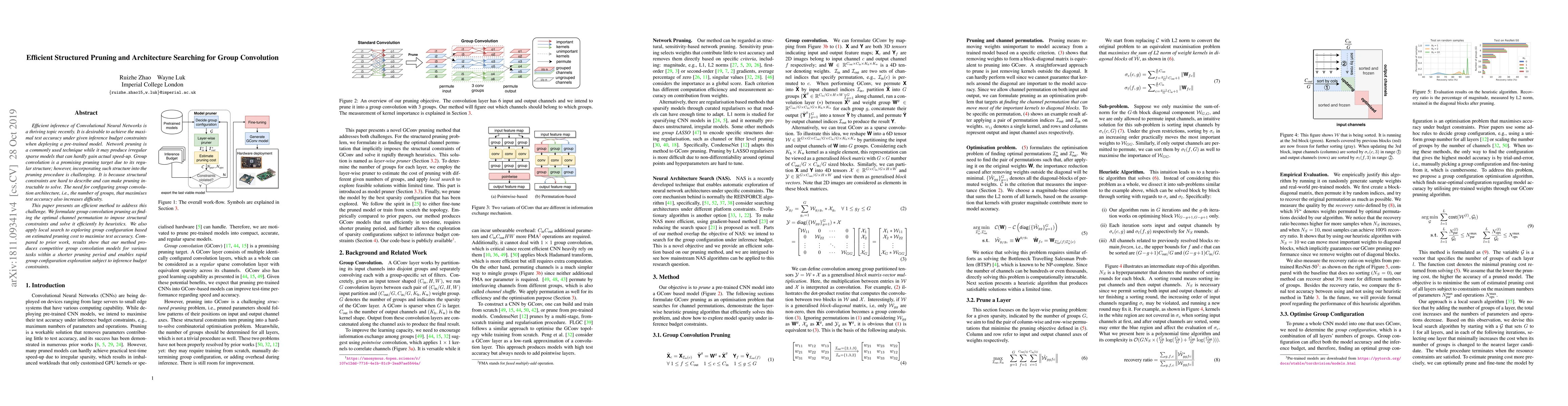 This paper proposes an efficient method for structured pruning and architecture searching for group convolutions, formulating the problem as an optimal channel permutation under structural constraints. The method leverages heuristics and local search to maximize test accuracy while adhering to inference budget constraints, resulting in competitive models with faster pruning and configuration exploration.