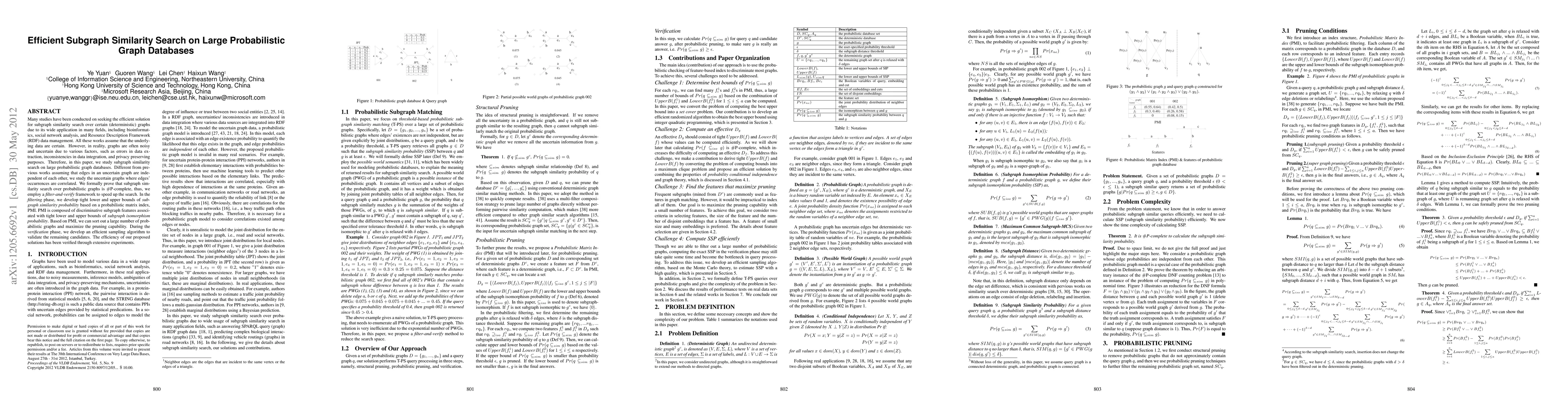 This paper addresses efficient subgraph similarity search in large probabilistic graph databases, where graph edges are correlated and uncertain. It proposes a filter-and-verify framework using a probabilistic matrix index (PMI) to prune irrelevant graphs and an efficient sampling algorithm for verification, demonstrating improved performance through experiments.