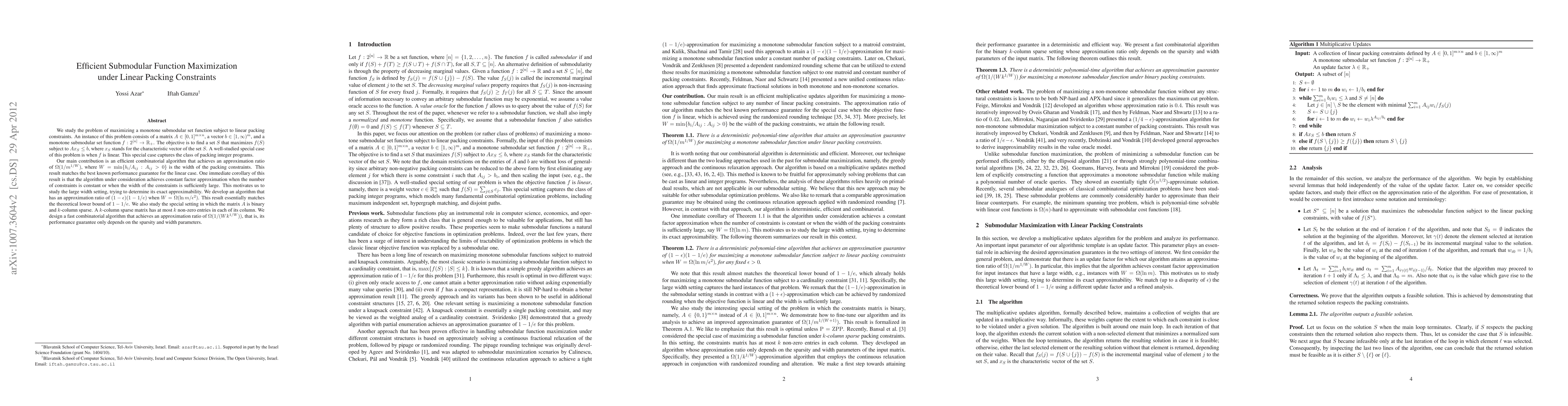 We study the problem of maximizing a monotone submodular set function subject to linear packing constraints. An instance of this problem consists of a matrix $A \in [0,1]^{m \times n}$, a vector $b \in [1,\infty)^m$, and a monotone submodular set function $f: 2^{[n]} \rightarrow \bbR_+$. The objective is to find a set $S$ that maximizes $f(S)$ subject to $A x_{S} \leq b$, where $x_S$ stands for the characteristic vector of the set $S$. A well-studied special case of this problem is when $f$ is linear. This special case captures the class of packing integer programs. Our main contribution is an efficient combinatorial algorithm that achieves an approximation ratio of $\Omega(1 / m^{1/W})$, where $W = \min\{b_i / A_{ij} : A_{ij} > 0\}$ is the width of the packing constraints. This result matches the best known performance guarantee for the linear case. One immediate corollary of this result is that the algorithm under consideration achieves constant factor approximation when the number of constraints is constant or when the width of the constraints is sufficiently large. This motivates us to study the large width setting, trying to determine its exact approximability. We develop an algorithm that has an approximation ratio of $(1 - \epsilon)(1 - 1/e)$ when $W = \Omega(\ln m / \epsilon^2)$. This result essentially matches the theoretical lower bound of $1 - 1/e$. We also study the special setting in which the matrix $A$ is binary and $k$-column sparse. A $k$-column sparse matrix has at most $k$ non-zero entries in each of its column. We design a fast combinatorial algorithm that achieves an approximation ratio of $\Omega(1 / (Wk^{1/W}))$, that is, its performance guarantee only depends on the sparsity and width parameters.