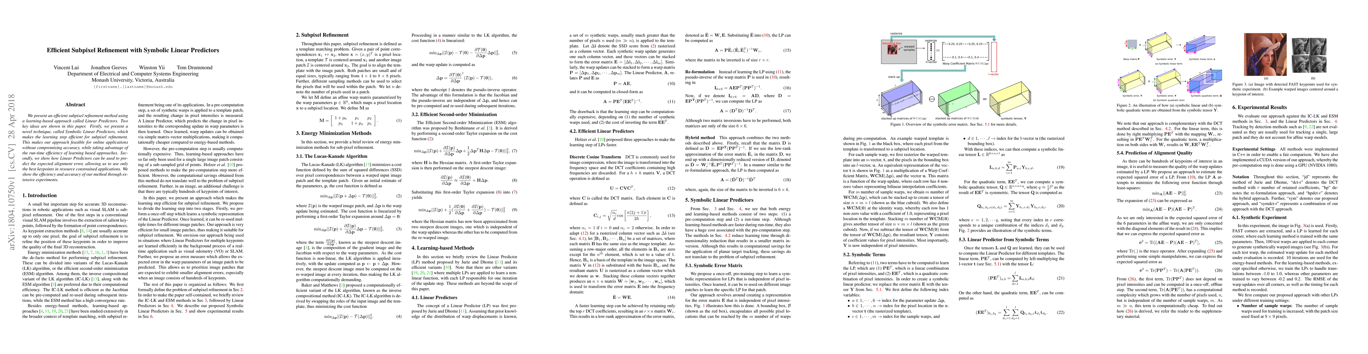 We present an efficient subpixel refinement method usinga learning-based approach called Linear Predictors. Two key ideas are shown in this paper. Firstly, we present a novel technique, called Symbolic Linear Predictors, which makes the learning step efficient for subpixel refinement. This makes our approach feasible for online applications without compromising accuracy, while taking advantage of the run-time efficiency of learning based approaches. Secondly, we show how Linear Predictors can be used to predict the expected alignment error, allowing us to use only the best keypoints in resource constrained applications. We show the efficiency and accuracy of our method through extensive experiments.