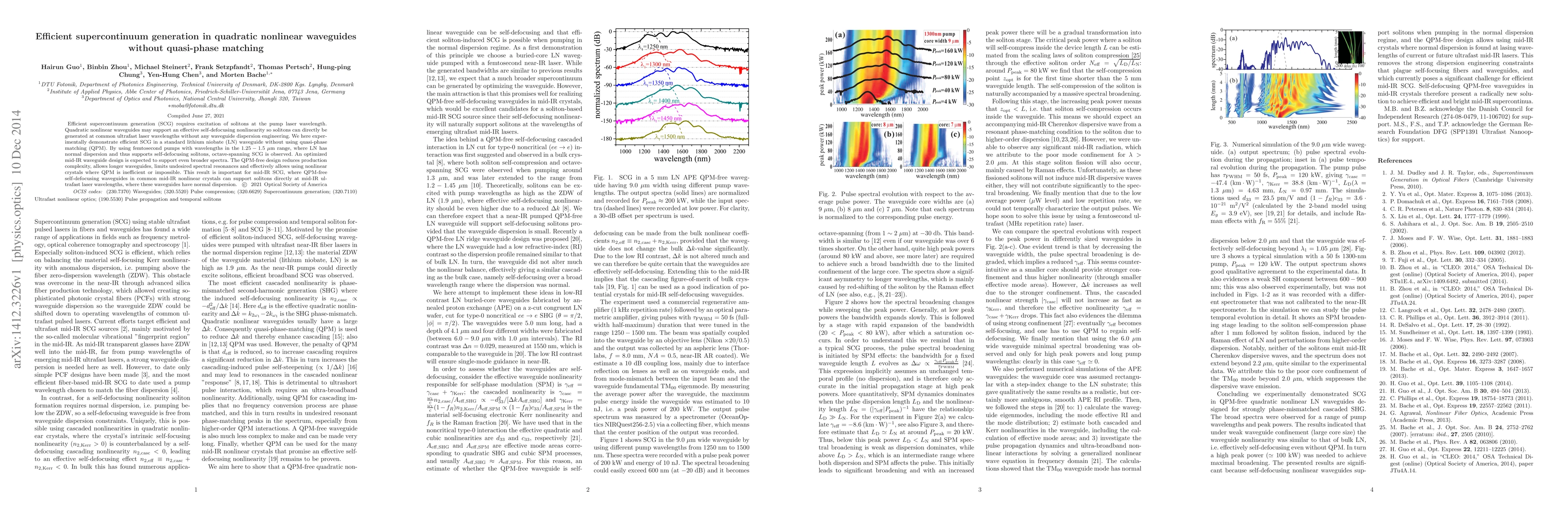 This paper demonstrates efficient supercontinuum generation in lithium niobate waveguides without quasi-phase matching, using femtosecond laser pumps in the $1.25-1.5 \mu\rm m$ range to excite self-defocusing solitons. The QPM-free design simplifies production and broadens the potential spectral range.