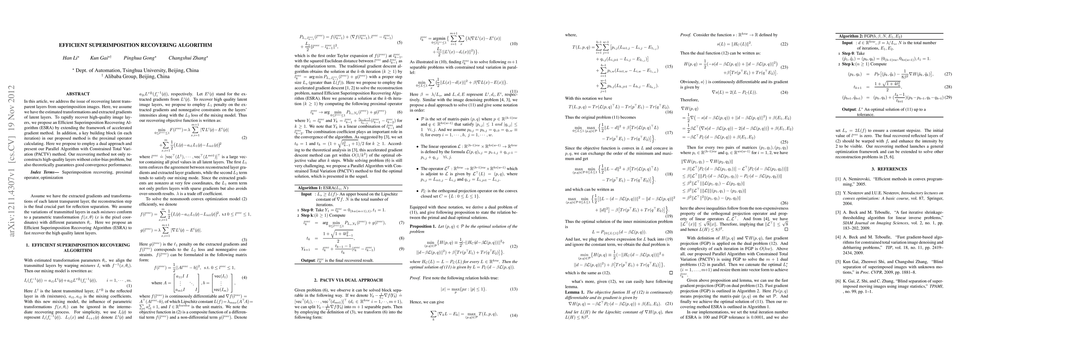 In this article, we address the issue of recovering latent transparent layers from superimposition images. Here, we assume we have the estimated transformations and extracted gradients of latent layers. To rapidly recover high-quality image layers, we propose an Efficient Superimposition Recovering Algorithm (ESRA) by extending the framework of accelerated gradient method. In addition, a key building block (in each iteration) in our proposed method is the proximal operator calculating. Here we propose to employ a dual approach and present our Parallel Algorithm with Constrained Total Variation (PACTV) method. Our recovering method not only reconstructs high-quality layers without color-bias problem, but also theoretically guarantees good convergence performance.