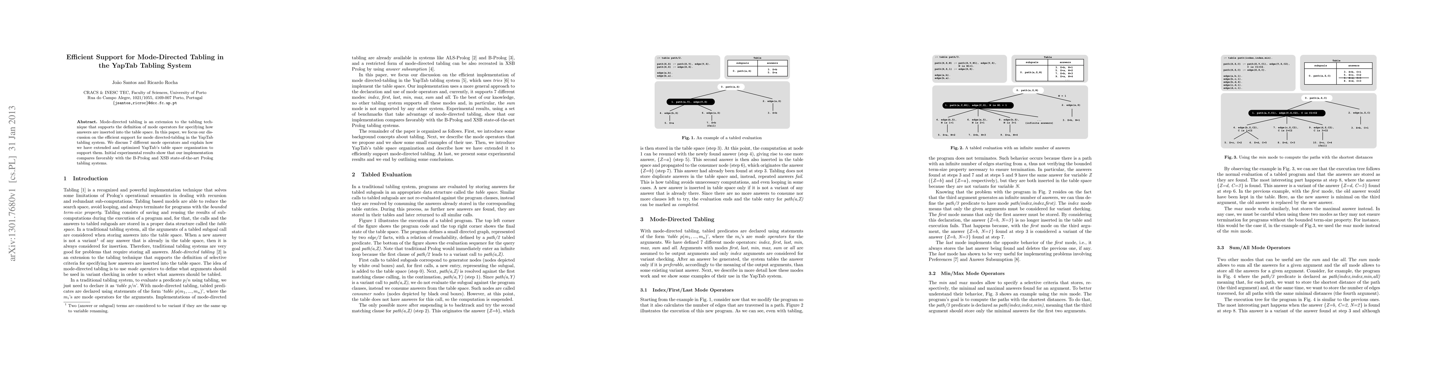 This paper presents enhancements to the YapTab tabling system for efficient mode-directed tabling, optimizing table space organization for 7 mode operators, and demonstrates competitive performance against B-Prolog and XSB tabling systems in initial experiments.