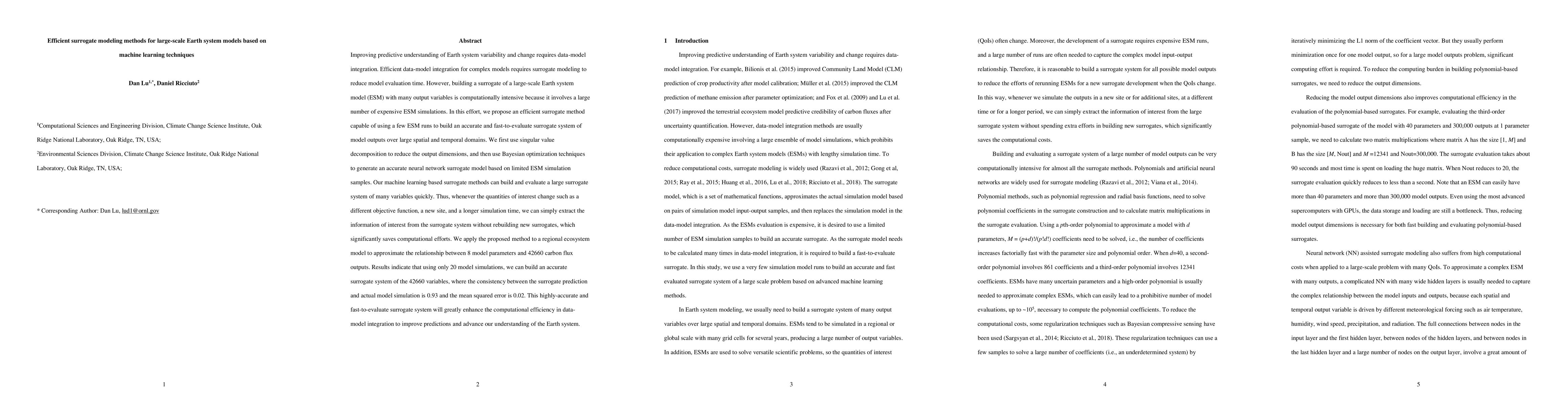 This paper proposes an efficient surrogate modeling method using machine learning to reduce the computational cost of large-scale Earth system models (ESMs). The method employs singular value decomposition and Bayesian optimization to create a fast-to-evaluate neural network surrogate based on limited ESM simulations, achieving high accuracy with only 20 model runs.