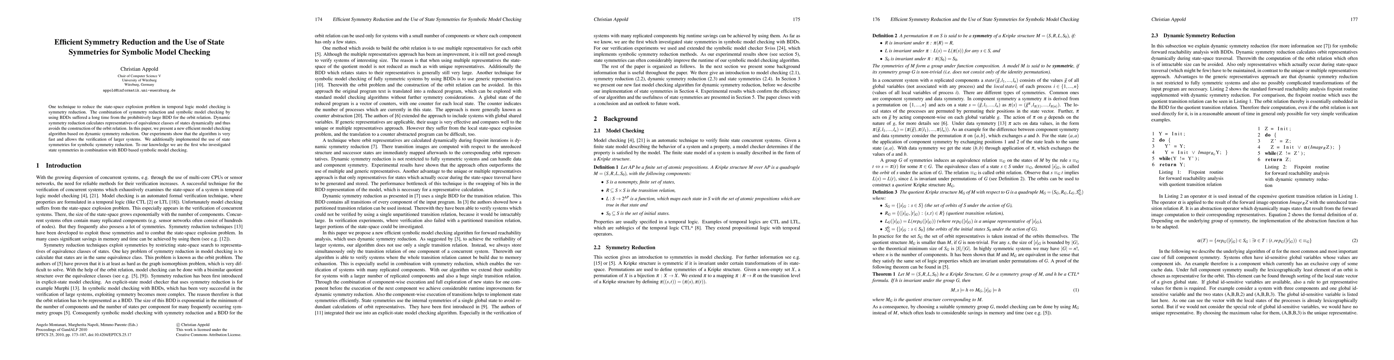 One technique to reduce the state-space explosion problem in temporal logic model checking is symmetry reduction. The combination of symmetry reduction and symbolic model checking by using BDDs suffered a long time from the prohibitively large BDD for the orbit relation. Dynamic symmetry reduction calculates representatives of equivalence classes of states dynamically and thus avoids the construction of the orbit relation. In this paper, we present a new efficient model checking algorithm based on dynamic symmetry reduction. Our experiments show that the algorithm is very fast and allows the verification of larger systems. We additionally implemented the use of state symmetries for symbolic symmetry reduction. To our knowledge we are the first who investigated state symmetries in combination with BDD based symbolic model checking.